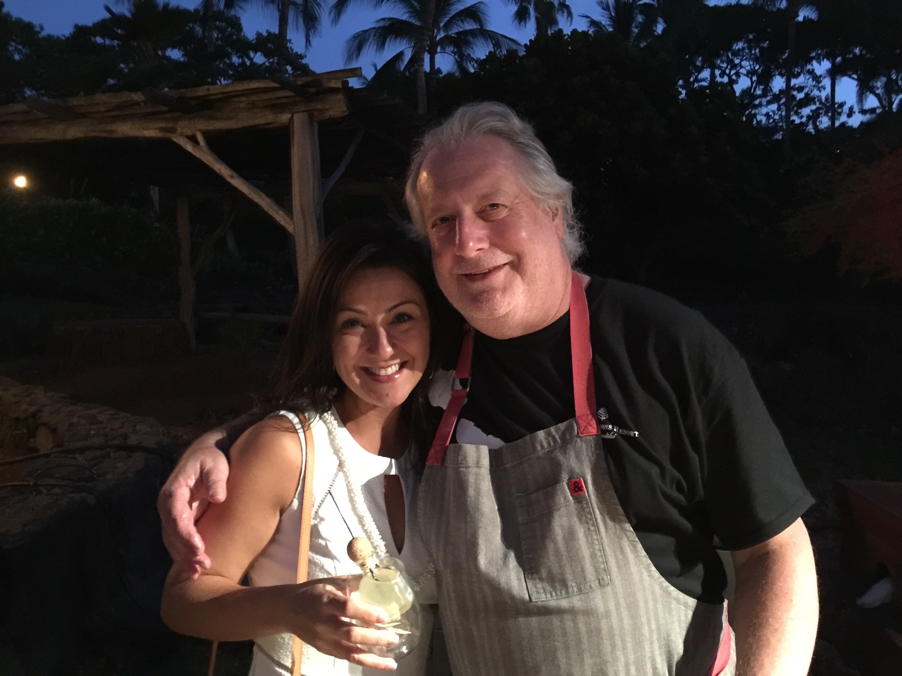 We got to the Chef Fest held at the Hoku Amphitheater at 6 p.m. and were greeted by the fun and sexy Patron girls serving Patron margaritas in miniature Patron bottles. Uncle Earl from the resort started the event with a blessing and spoke about how the chefs and partners present live the philosophy of bringing farm to table and taking care of our kuleana. He spoke of the need to nurture the resources we have in order to continue to be blessed with the bounty it provides. The event then started with Uncle Earl calling for the party to begin! We walked around to the different stations and made it a point to try all the plates being offered by the chefs present tonight. We were so impressed by the friendliness of all of the chefs present. Misty got a great picture with one of her chef idols, Jonathan Waxman!