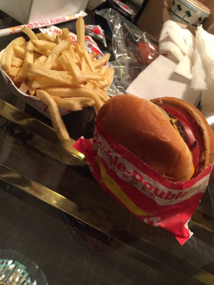 At the resort, we met up with the last two members of our group, former Hiloan and now San Diego resident (but still Hilo girl at heart) Marla and her friend Chyoko (who is married to a Hiloan). Marla and Chyoko graciously stopped at the store before our arrival and set us up with the essentials to get us through the weekend. Water, snacks, and bubbly. Some of the ladies were a little hungry after the flight and so a trip was made to In-N-Out Burger to satisfy the hunger.