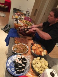 On to the food–as an amateur and novice in the kitchen, I was intimidated the first year we had the group together, but I found that this group of friends made everything from the cooking to the carving easy for me. I make a few dishes and each family graciously brings some of their favorite dishes to share. We always end up having an incredible array and quantity of food and everyone is happy and full at the end of the evening. This year, we had a delicious deep-fried turkey, ham, prime rib, baked mahi mahi, spinach pasta, Caesar salad, yams, oxtail soup, spam musubi, Portuguese sausage stuffing, mashed potatoes, cornbread, and more for our feast. We had lots of desserts too–homemade pies, brownies, banana cake–Eri’s lilikoi chiffon pie is always a hit with everyone!