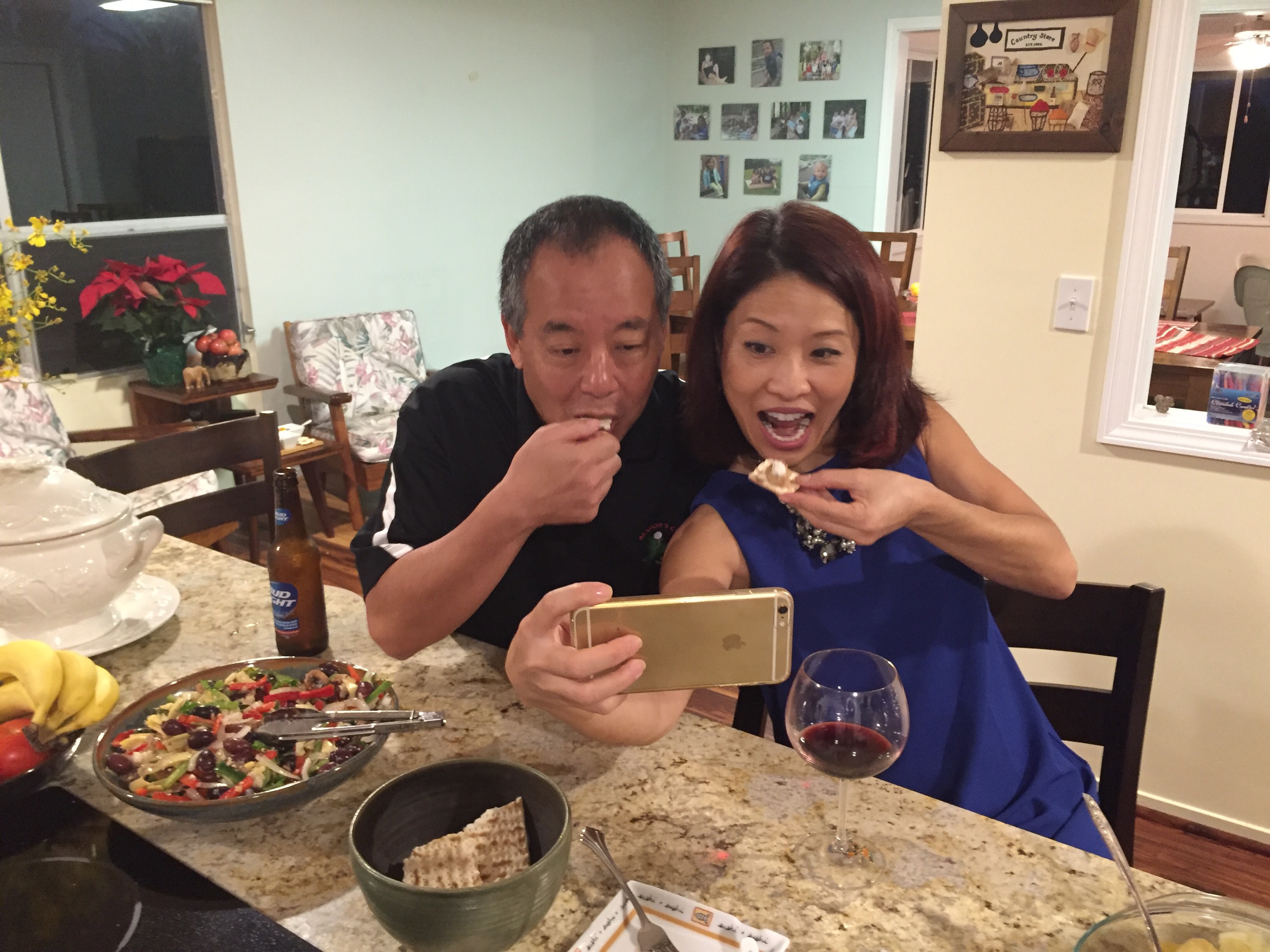 This year, one of the side dishes included gefilte fish. We had it with matzo crackers and horseradish. It may sound strange and may look a little strange, but it really isn’t so bad. My husband indulged me in my desire to memorialize our gefilte fish eating experience by taking a selfie with me. He’s so patient with me.