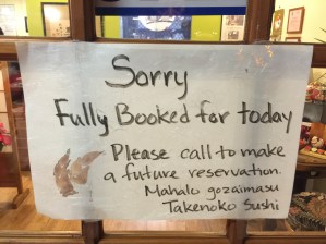 In order to make sure that I can fulfill future Takenoko Sushi cravings, my system is to secure my next reservation each time I visit.  Between my reservations and those of my friends, I’ve been pretty lucky at being able to fulfill my sushi craving pretty regularly here in Hilo.  So, at the end of the evening, I went up to pay my bill and make my next reservation.  I asked to make a reservation for eight people (as I always do) so I can make a ladies night out of it.  When I asked Pam, the co-owner of the restaurant, when their next opening was, I was quickly and apologetically informed that there is not another opening for eight people until 2017!!!  It isn’t even 2016 yet and the entire 2016 year is absolutely full!So sad!  However, I’m happy to know that I have at least a few upcoming reservations for 2016 that were made prior to tonight.  Was just hoping for a few more to round out the year.  Let me know if you need to fill a seat for your Takenoko reservation–I would be happy to assist.