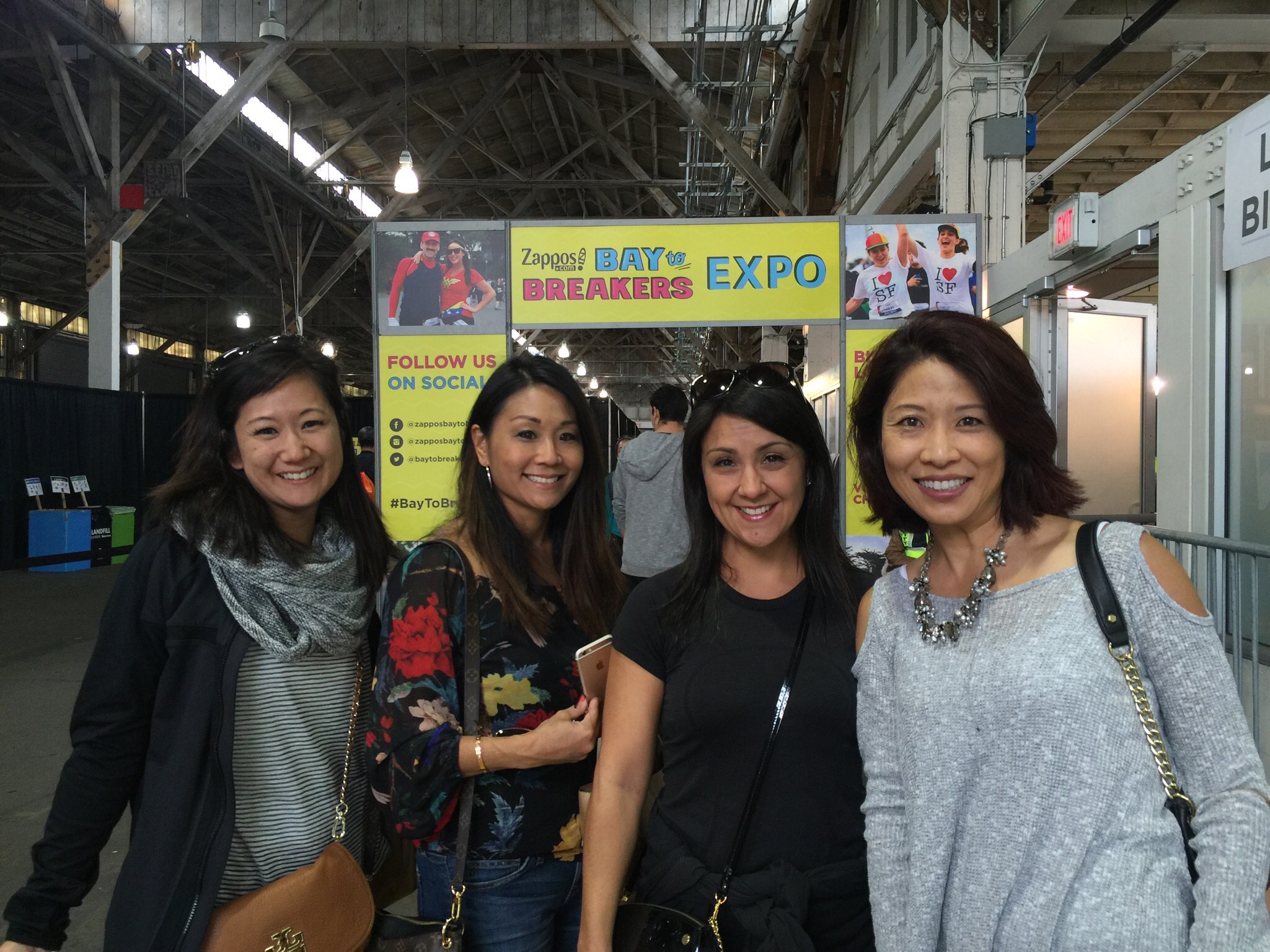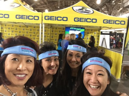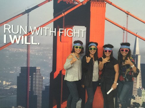 We made it to the Bay to Breakers Expo at Pier 35. We went there to pick up our race t-shirts. We were ready with our bib numbers, got in line, identified ourselves and our bib numbers and were promptly told that we had to have the bib itself in order to pick up our shirts. Shucks, we didn’t bring the bib with us to the Expo since our room wasn’t ready at Hotel Vitale and we hadn’t unpacked our bags with the packets in them. We had no choice but to pick up the t-shirts after the race at the finish line festival.We still enjoyed the expo.  Under Armour had fun backdrops with which we could take commemorative photos. Do you like the neon sunglasses that were part of the B2B swag? #RunWithFight #IWill #WeWillWe also found these cool B2B sweatbands and tried rocking the crazy look complete with puffy hair.