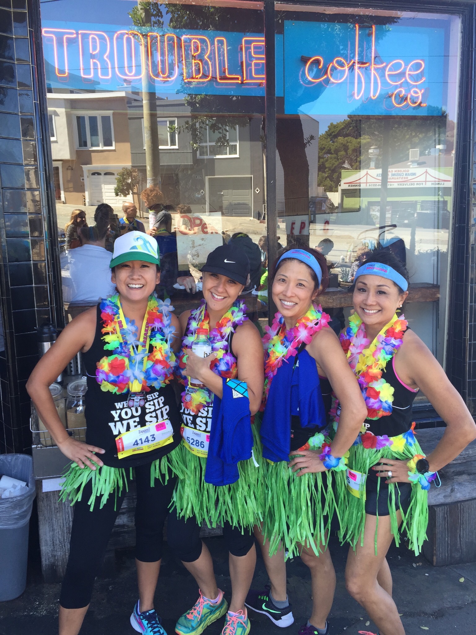 Wendy won a Geico t-shirt at this booth! There were many other booths hawking wares from clothing to fitness accessories to teeth whiteners to snacks.Day of the race is here.  We got ready for the race and headed down to our corral.  There were over 40,000 participants in this race so the organizers stagger the start time for each group. As we waited, we got hit by flying tortillas as we stood in line. I did not know about this crazy tradition but went with the flow and did some throwing of tortillas myself. Tortillas go pretty far if you throw them well. Sounds like a fun party game!We didn’t have to go into the sobriety tent but took a pic in front of it anyway with our non-sobriety tank tops. #WhenISipYouSipWeSipimg_3333We made it to mile 7 and we are still smiling. I was so happy to see this sign and know that we had less than one more mile to go.  My buddies could have easily run another 10 miles. Not me–I was happy to see the finish line! We finished in the top half of all finishers!After the run, we met up with Wendy’s cousin who took us to Trouble Coffee Co. on Judah Street.  We got lattes, a coconut drink, and one-inch thick toast slathered with peanut butter and honey. I heard that there is an interesting background about how the shop started, but I couldn’t find documentation about their background.  I couldn’t find a website and their FB page wasn’t updated. Based on the crowd I saw at the shop that day, they don’t need any advertising. They have a loyal following.