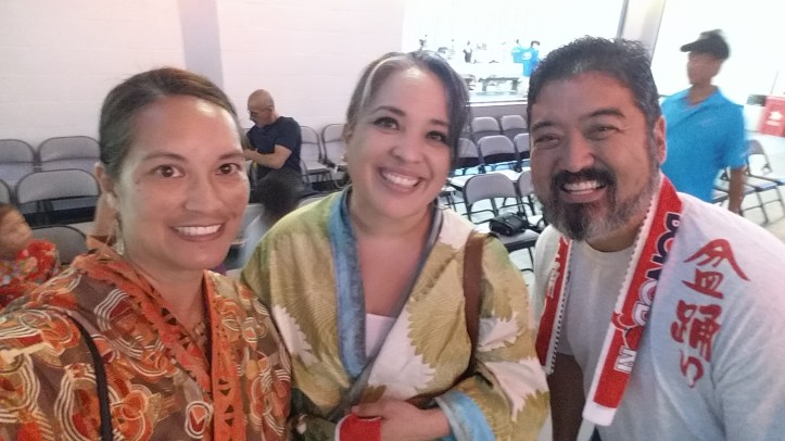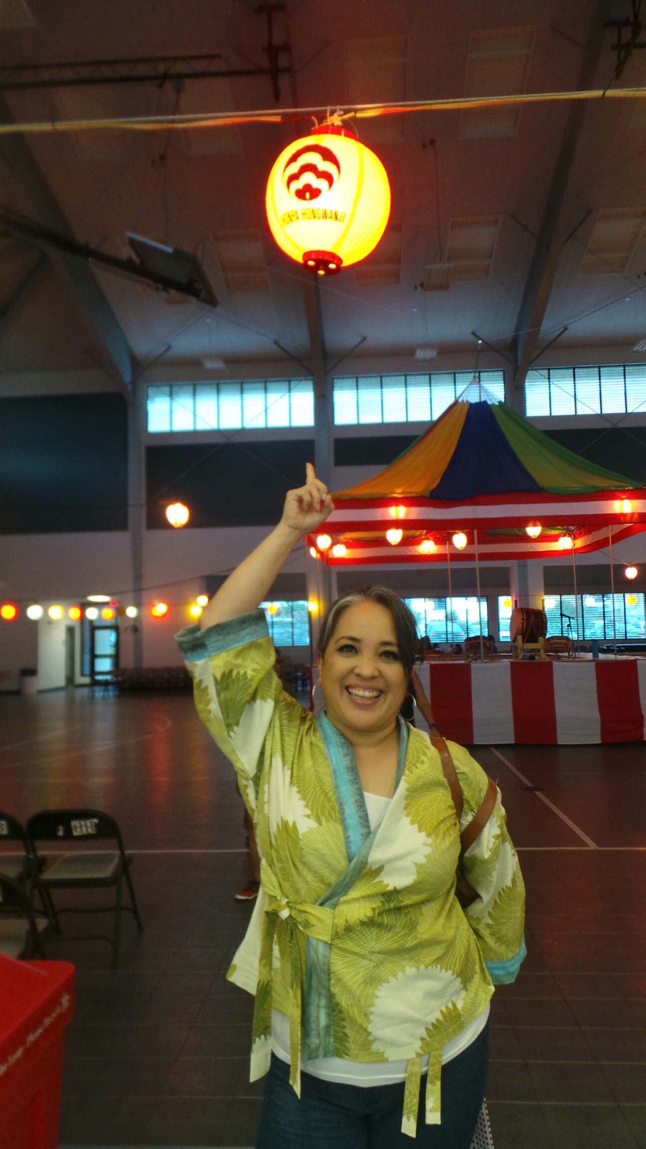 I definitely wanted a custom happi coat and suggested that we debut her creations right away. She agreed and, with the help of her equally talented mother-in-law, whipped up two beauties for us. We planned for the obon festival put on by the Honpa Hongwanji Hilo Betsuin, at Sangha Hall. It would be Carlen’s first ever bon dance.
