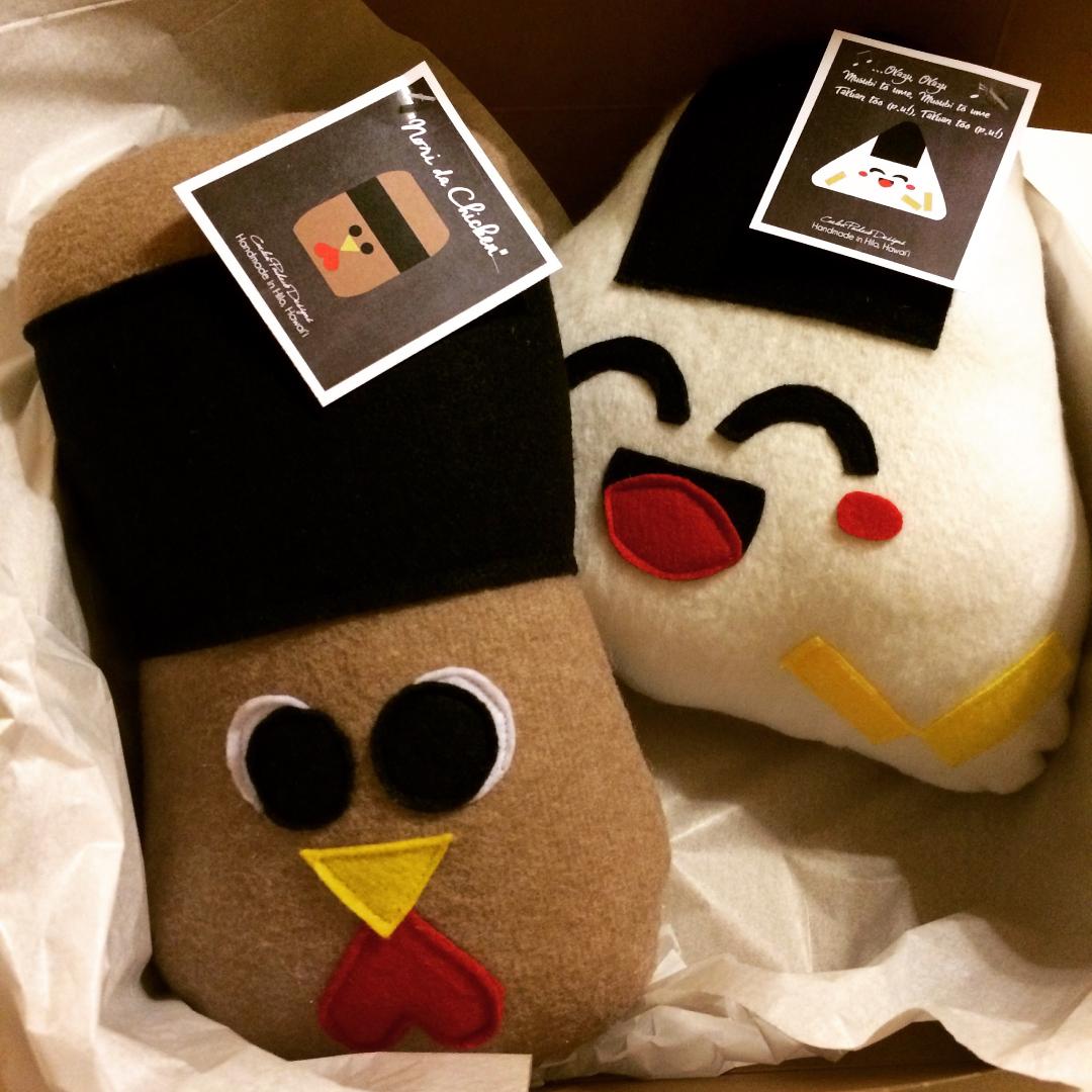 “Nori” the chicken available only at Kawamoto Store next to his buddy “Ume Musubi” made for ABC Preschool teachers.