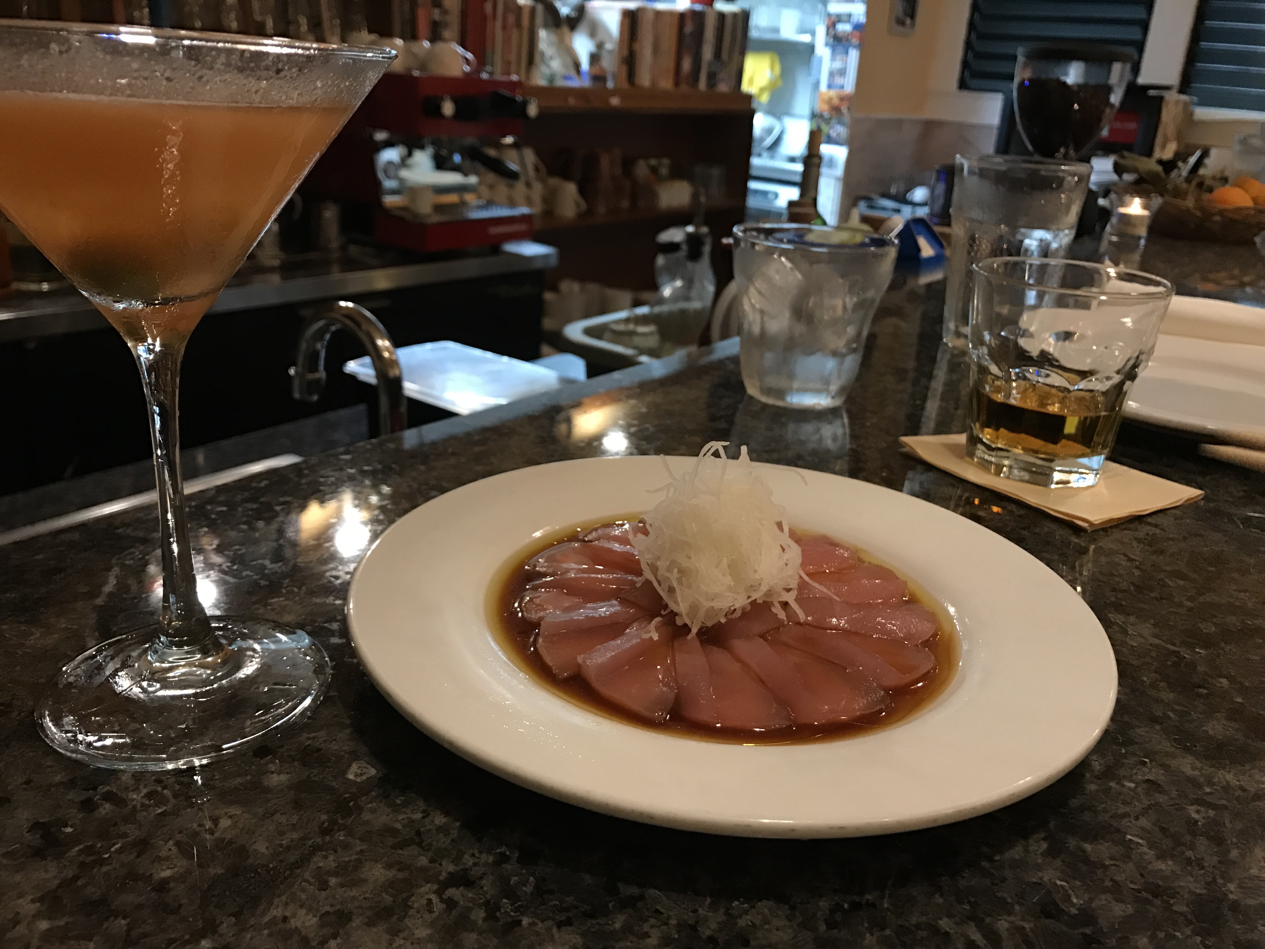 I recalled seeing an Instagram post from Moon & Turtle earlier in the day about a plate of beautiful ahi belly. I saw their menu posted on their Facebook page and saw that the ahi belly featured as well as my favorite dish, their smokey sashimi. I called to make a takeout order of ahi belly and smokey sashimi but unfortunately, they were too busy to prepare takeout orders. So–my husband and I decided to eat at the restaurant. Our children were tired from the day and preferred to stay home rather than go out–so it was just the grownups at dinner.