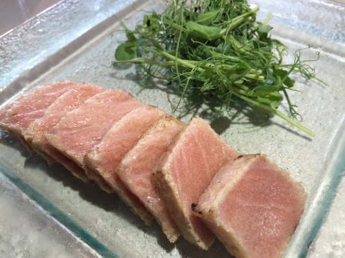 I love otoro sashimi. I have never had it seared and was skeptical of ruining the perfection that is otoro, but this one was amazing. The sear was very light. The otoro tataki was served with wasabi and a Ho Farms watermelon radish salad.