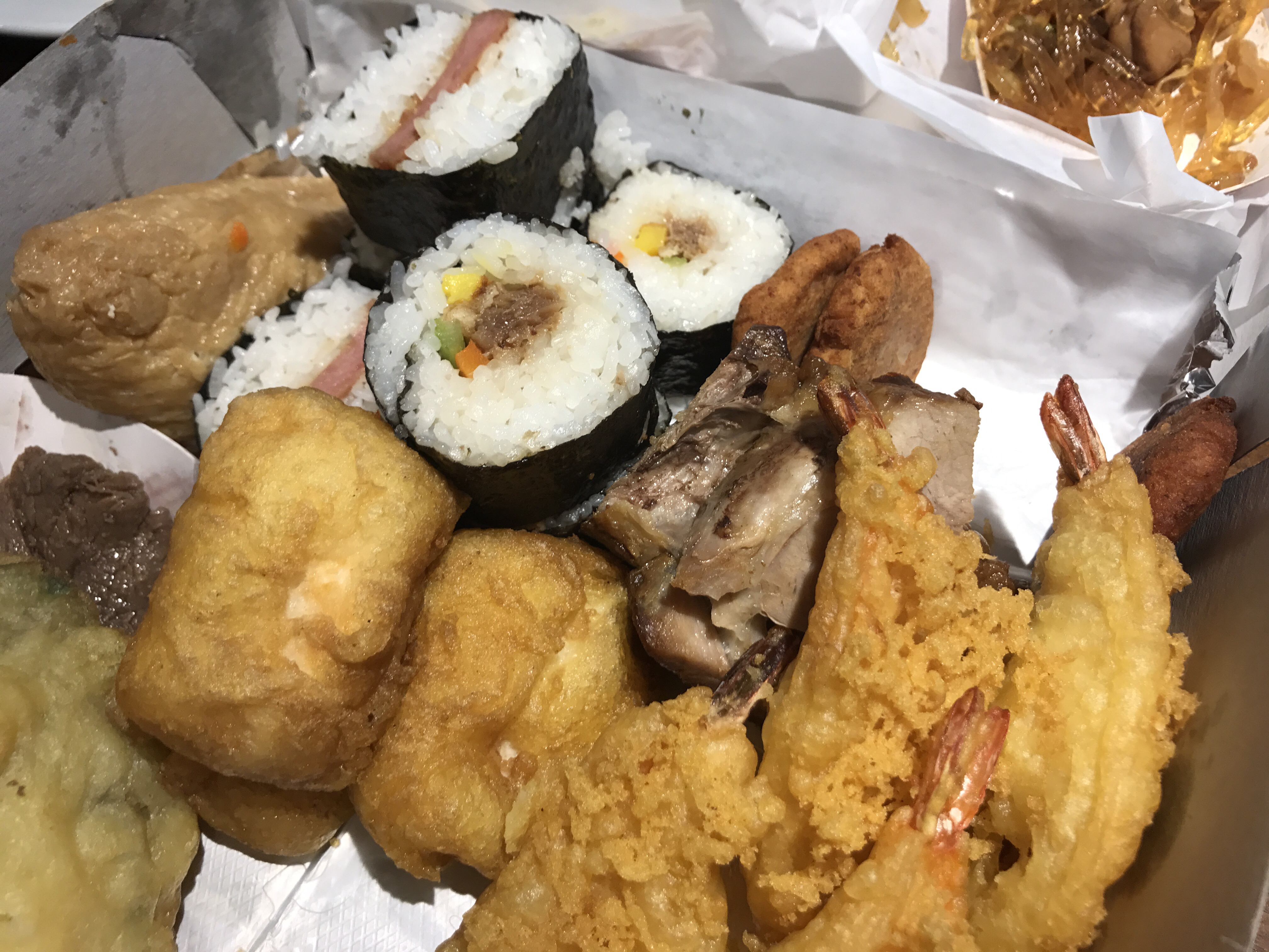 We got spam musubi, maki sushi, cone sushi, shrimp tempura, hash patties, mahi tempura, eggplant tempura, BBQ beef, shoyu pork, and hot dog. The food you see pictured above is the box after several people served themselves. There was so much delicious food.