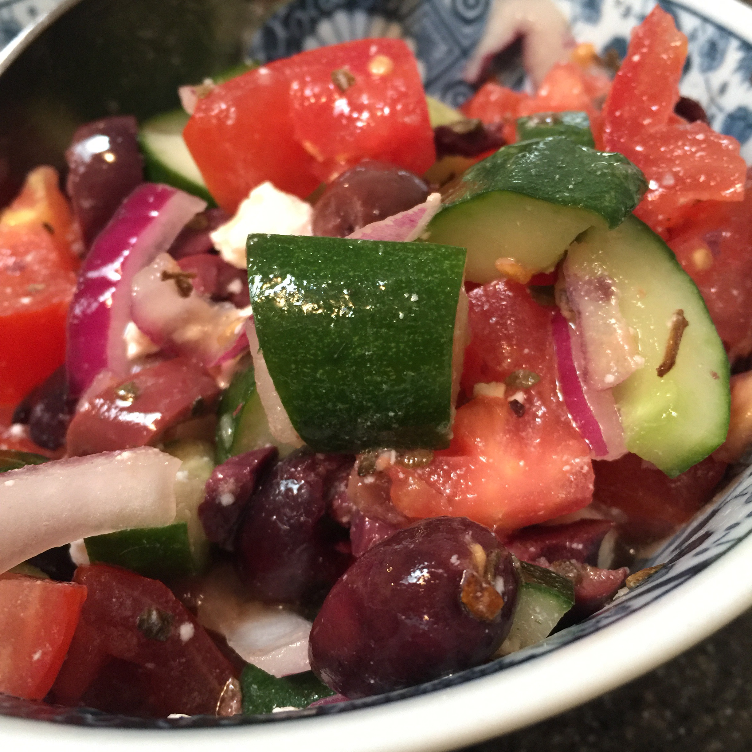 Today, I looked on Pinterest for some cucumber recipe ideas and came across a Cucumber Greek Salad from Belle of the Kitchen. This recipe is just my speed–just chop and combine. I used local cucumbers, Kamuela tomatoes, and a red onion.I combined it with olive oil, lemon juice, oregano. I seasoned with salt and pepper, sliced some pitted kalamata olives and mixed in with crumbled feta cheese. Perfect side dish for a light dinner.