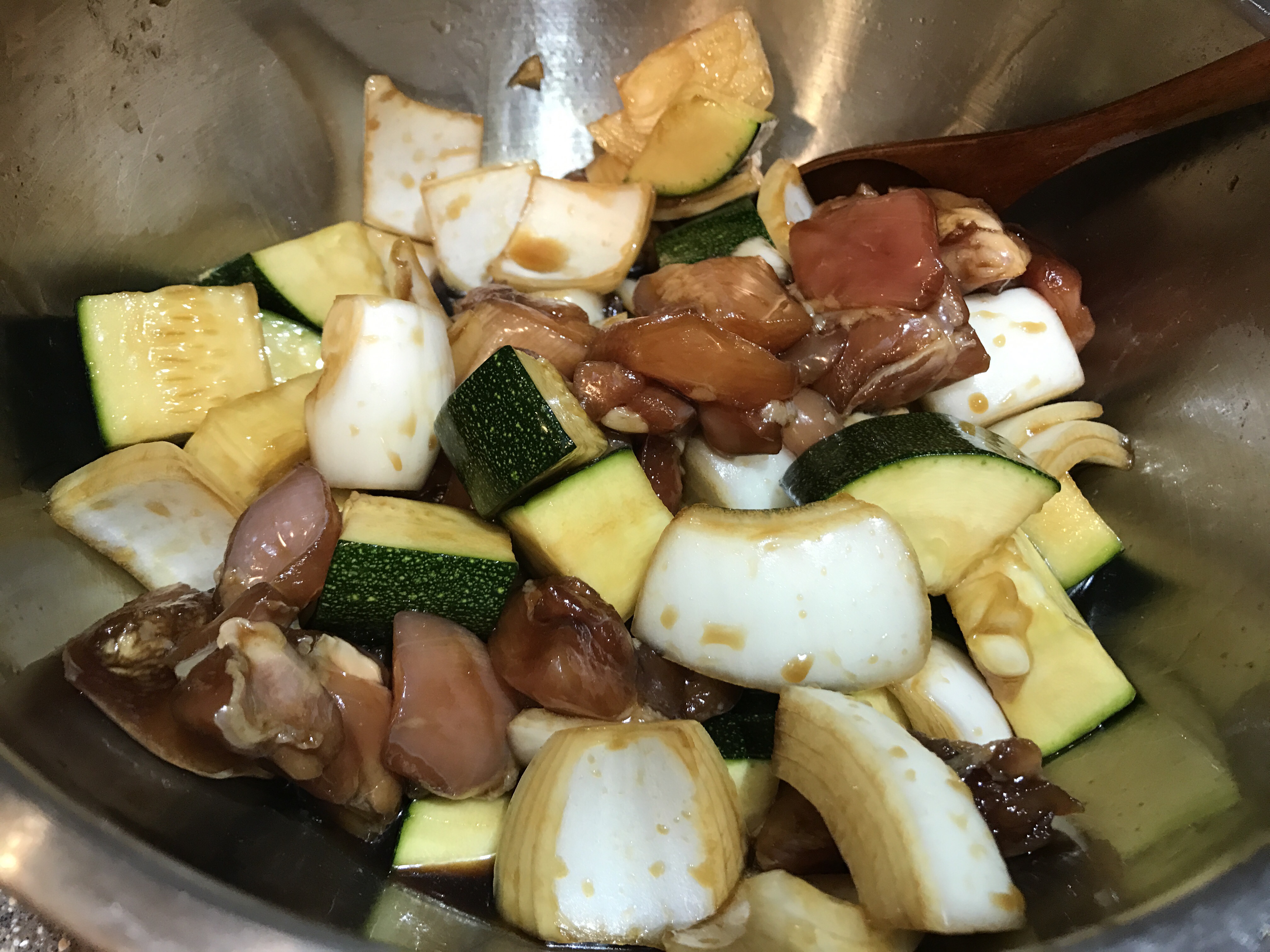 I soaked bite-sized chicken thighs, onions, and zucchini in a marinade of shoyu, mirin, and sugar. The recipe didn’t call for zucchini but since I had some locally-grown zucchini from my CSA delivery from the Hawaii Food Basket, I decided to add it to the mix. After about 30 minutes, I threaded the ingredients on skewers and prepared them for cooking.