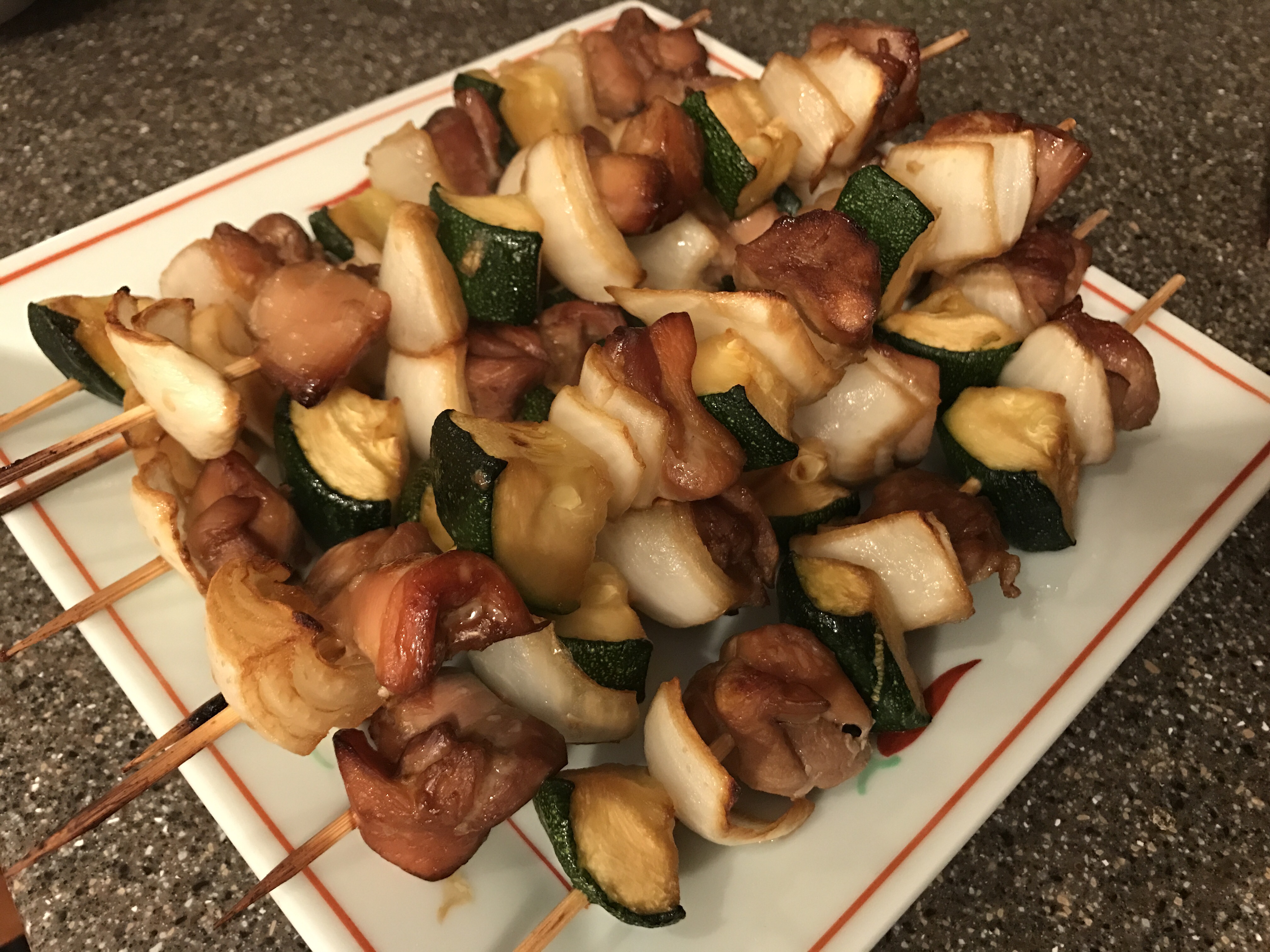 One menu item that my family has not rejected is yakitori. Somehow, food on a stick is fun. Many cultures have food on sticks and I enjoy them all–from yakitori to kebabs to corn dogs–all delicious!