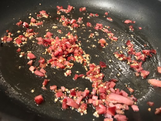 On this particular day, I did not have pancetta or bacon. I did have some delicious Tina Evans-smoked meat in the freezer. I proceeded to chop the smoked meat into small pieces and fry it up in a pan with some garlic.