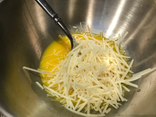 When the pasta was done, I drained it and put it in the pan with the smoked meat and garlic. I coated the pasta with a mixture of pasta water, egg yolks, salt, pepper, and parmesan cheese.