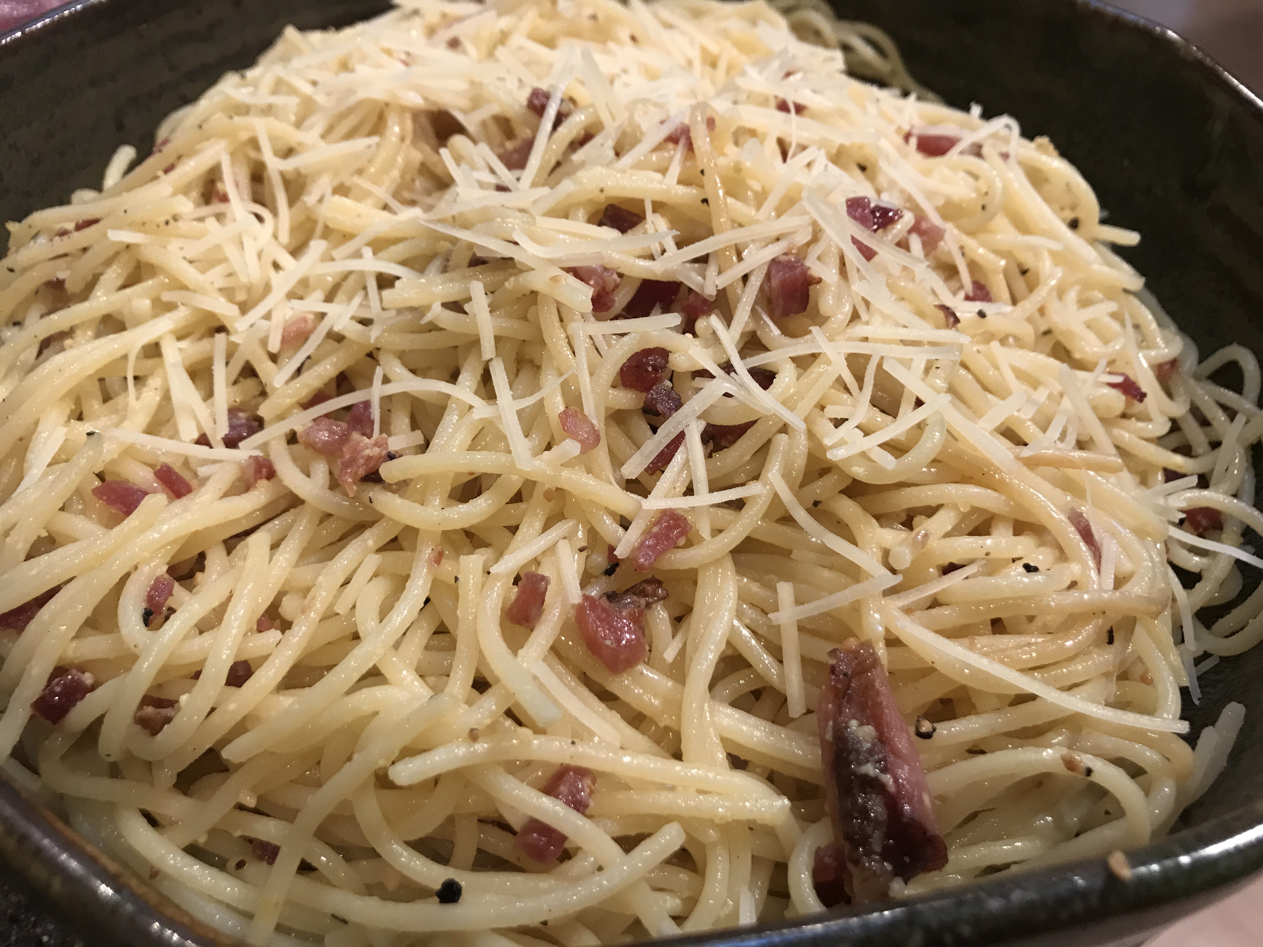 Pasta is an easy dinner that we often enjoy in my home. On this particular day when I announced to my daughter that we would be having pasta, she requested carbonara. I enjoy carbonara in restaurants and was willing to give it a try. However, in my usual style, I made the meal with the ingredients I already had in my home.