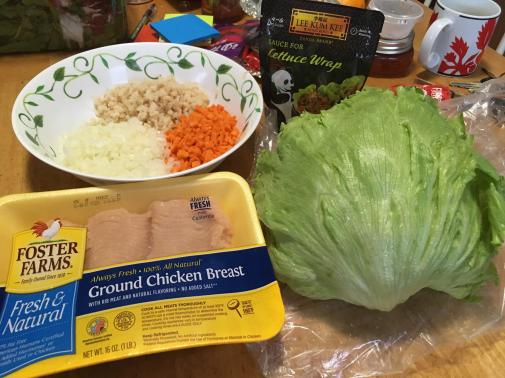 We picked up lettuce, ground chicken, water chestnuts, carrots, onions, Lee Kum Kee lettuce wrap sauce, sweet chili sauce, and olive oil.