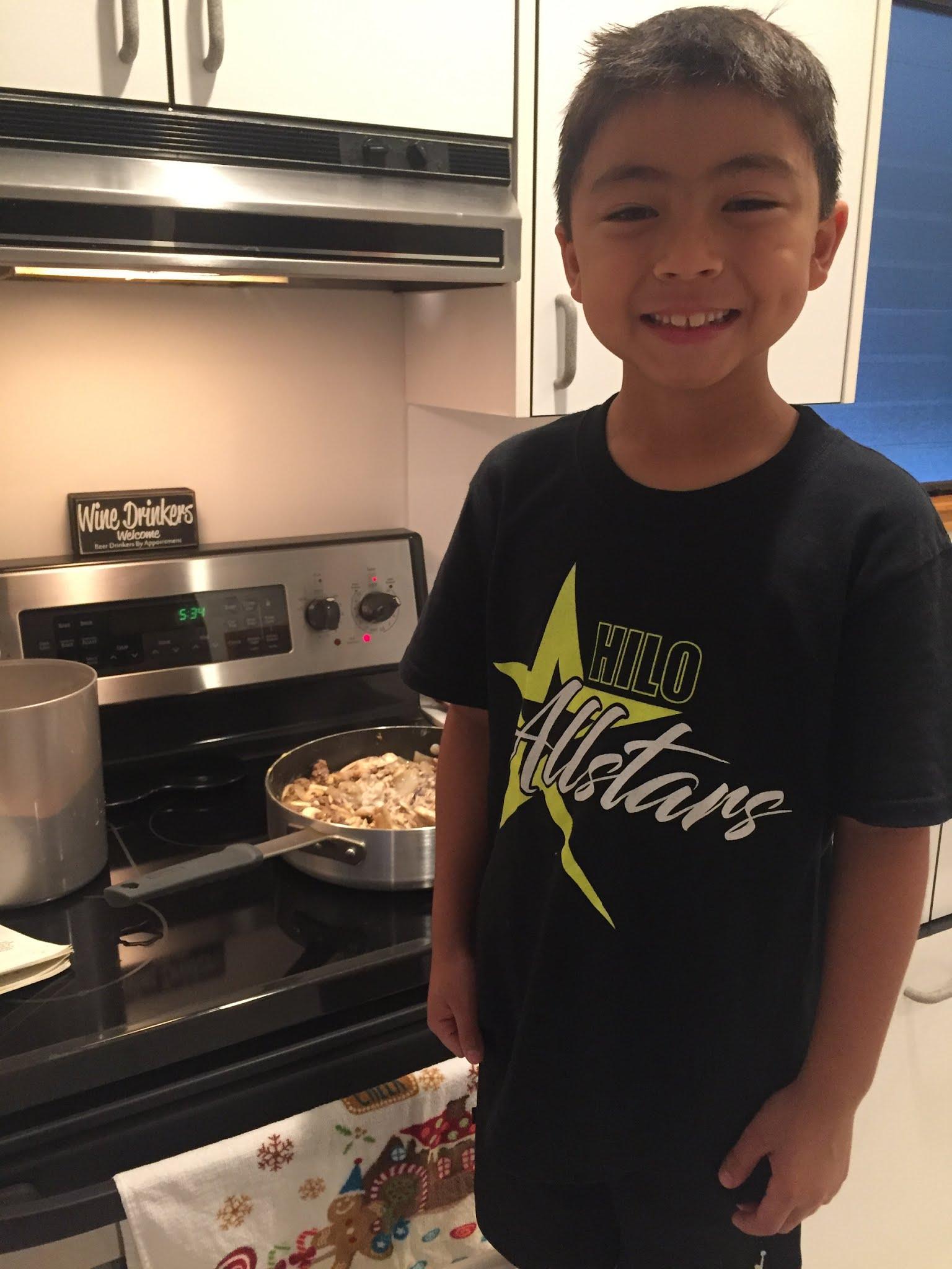 I can confirm that it has been pretty cold in Hilo lately. How cold? Not that cold, high 50’s. Beef Stroganoff is an easy and satisfying weeknight meal that will warm your family up. If your kids like to “help” in the kitchen, this an appropriate recipe to practice chopping easy stuff like mushrooms.