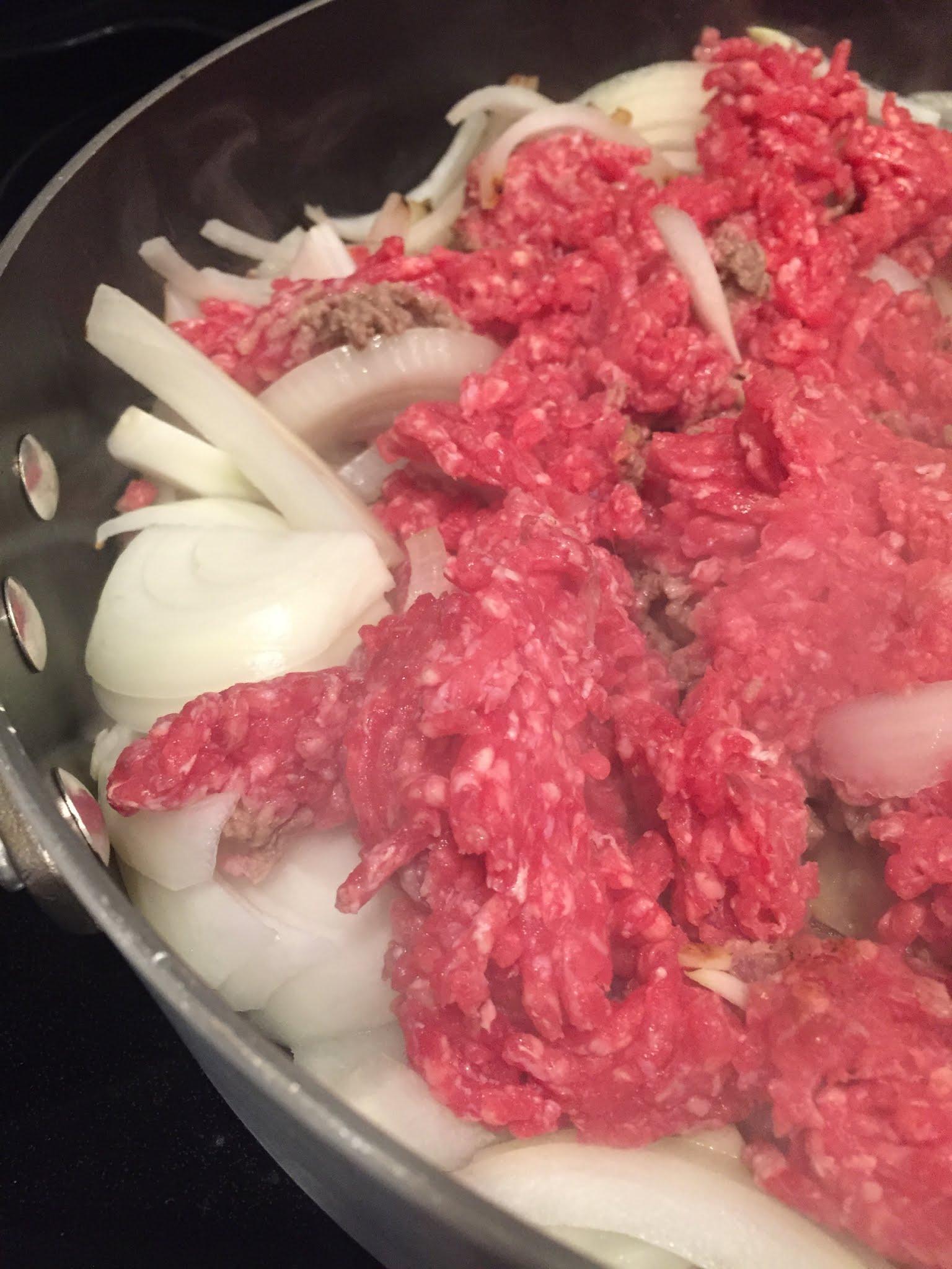 Over medium heat, saute the onions and mushrooms until onions are translucent (unlike the pic above!) Add the ground beef, salt, and pepper to the onions and mushrooms.