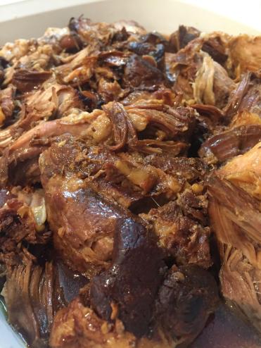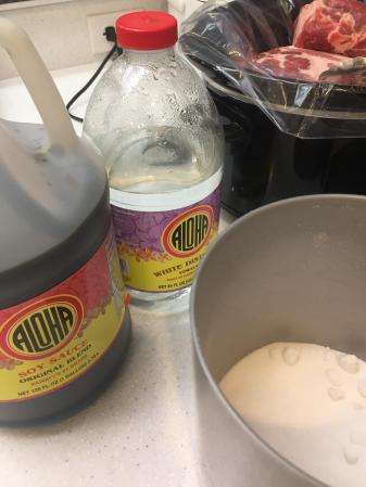 - Mix shoyu, sugar, and vinegar together. Pour the sauce over and set the slow cooker. Your slow cooker may vary. It’s ready when it is fork tender: