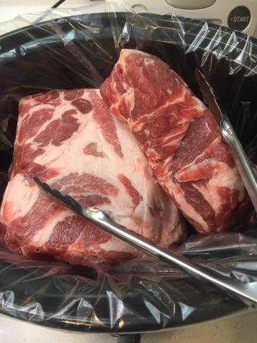 - If using, line your 6-8 quart slow cooker with a liner. Add pork shoulder to the slow cooker.