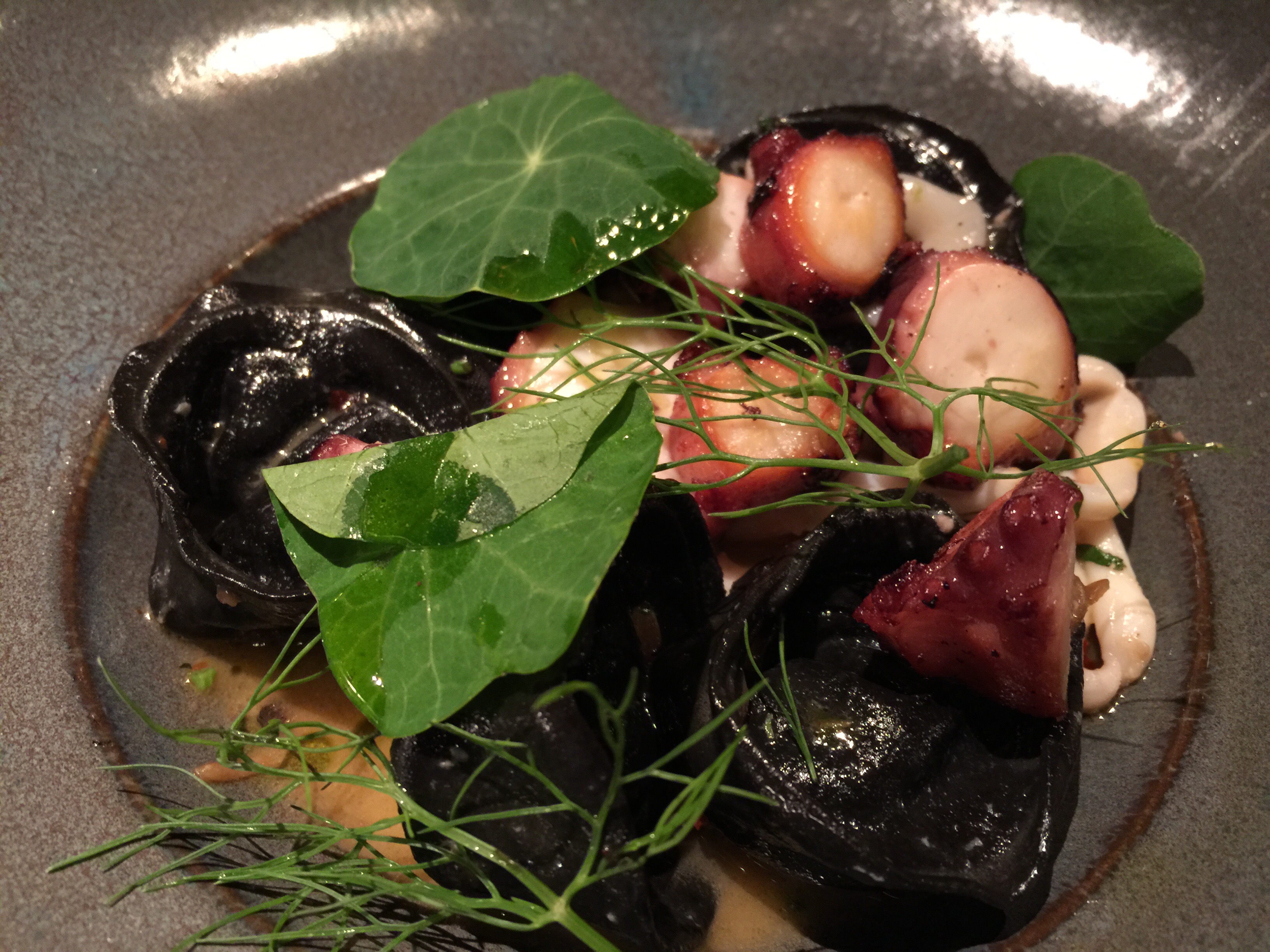 Spanish Octopus & Sepia Tortellini–Tortellini with olive oil, roasted potato & mint, East Coast calamari, Mandarin oil & Marash Pepper.