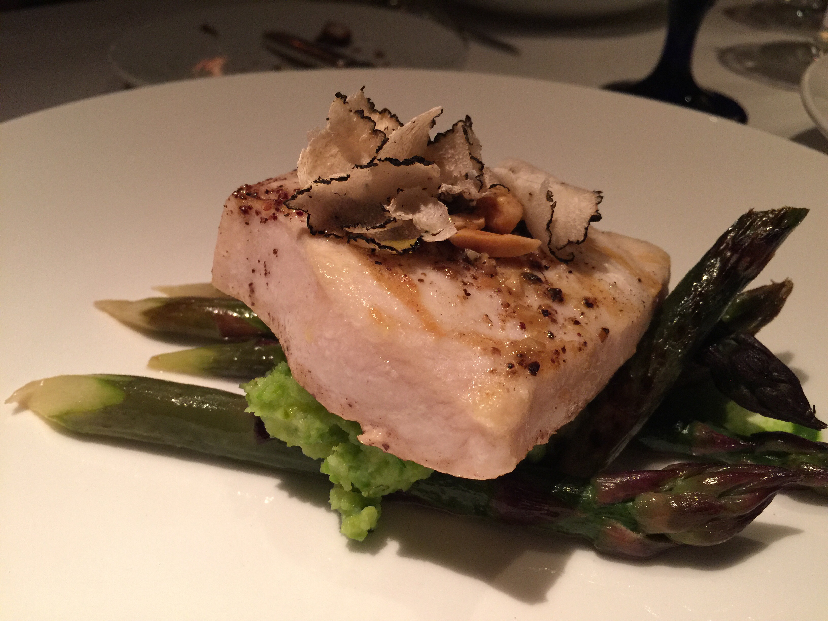 Local Wild King Salmon–Grilled with sumac & truffle hotel butter, Zuckerman Farm asparagus, Yukon potato crushed with pea tendrils & English peas, brown butter, Marcona almonds & summer truffles.