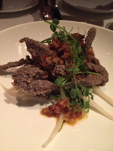 Softshell Crab–Black rice jacket, stuffed with scallop & Dungeness crab, hand-rolled rice noodles, XO sauce.