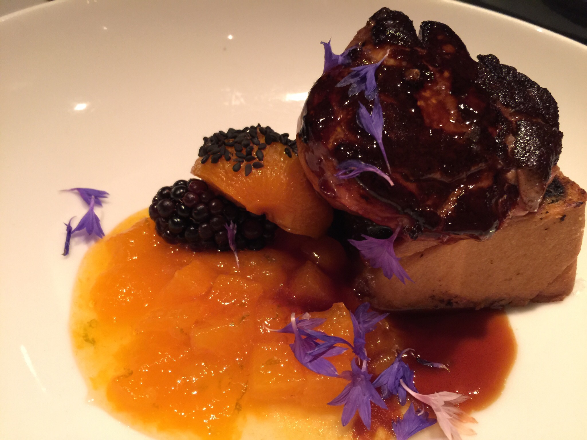 Hudson Valley Foie Gras–Black sesame babka, lime kiwi preserve, honey gold apricots & fresh blackberries.