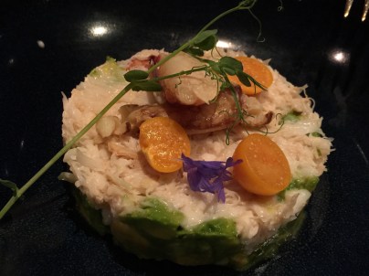 Crab & Avocado–Handpicked local Dungeness crab, hearts of palm & coconut cream, gooseberries & white tumeric.