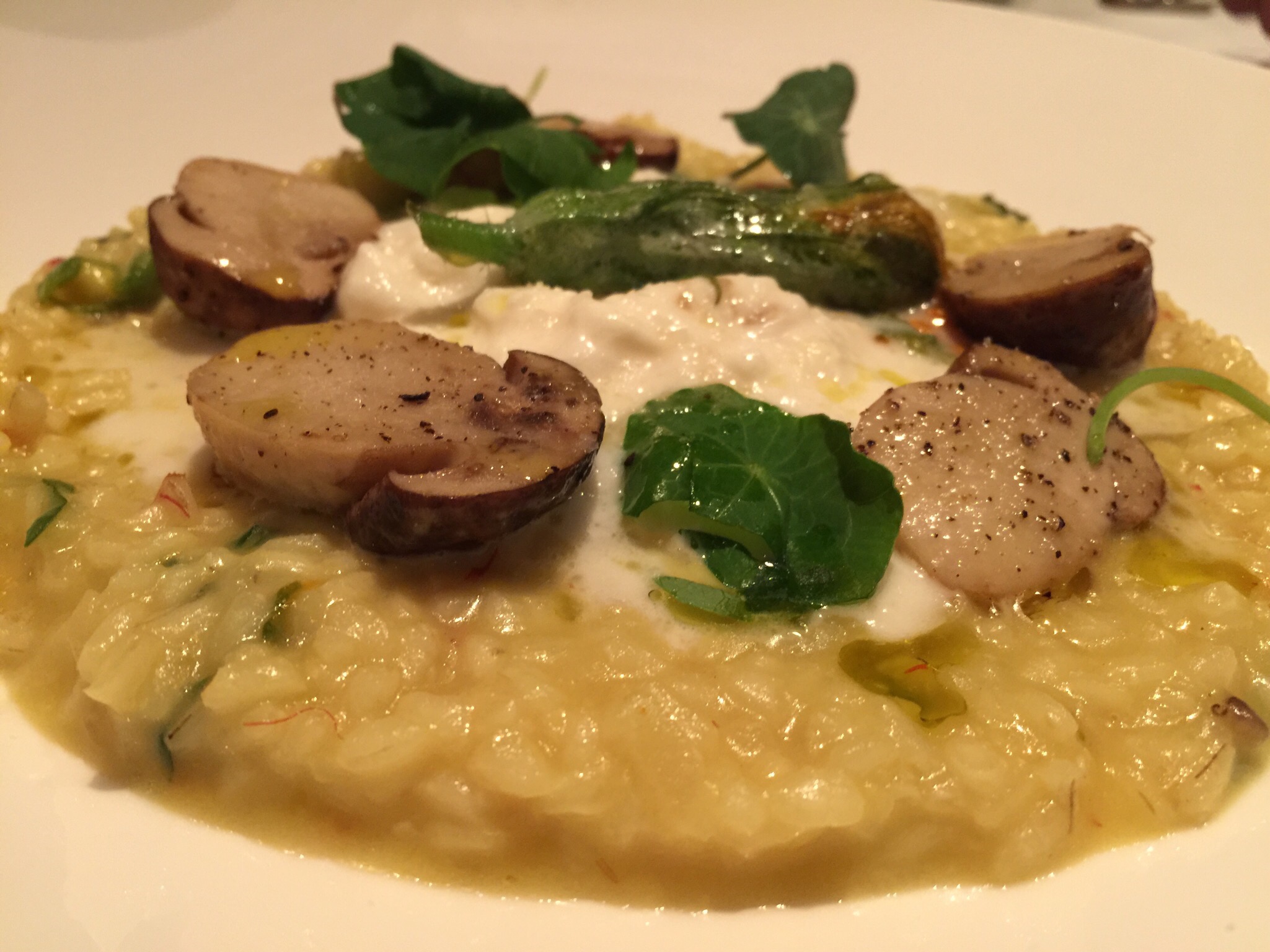 This is my personal favorite–Roasted Porcini Mushrooms & Squash Blossom Risotto–fresh California porcini mushrooms roasted with garlic & thyme, Vialone Nano risotto with safflower, nasturtium & squash blossoms stuffed with porcini & mascarpone.