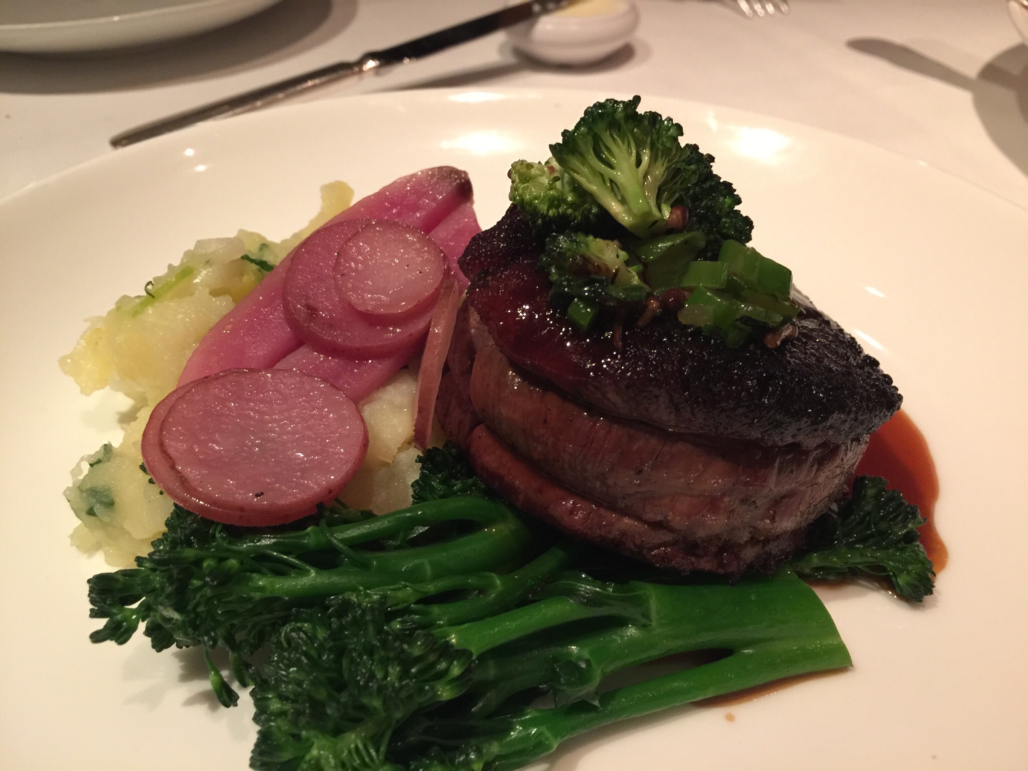 And because we are a steak-loving bunch, we ordered the Angus filet with olive oil potato with soft fennel, leeks & arugula, marinated fingerling potato, broccoli & kale Limone, and a golden Enoki mushroom relish & jus.