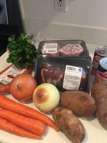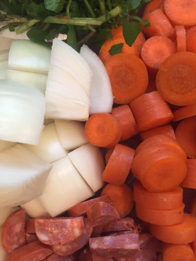 - Chop the watercress, Portuguese sausage, onions, and carrots. Set aside.