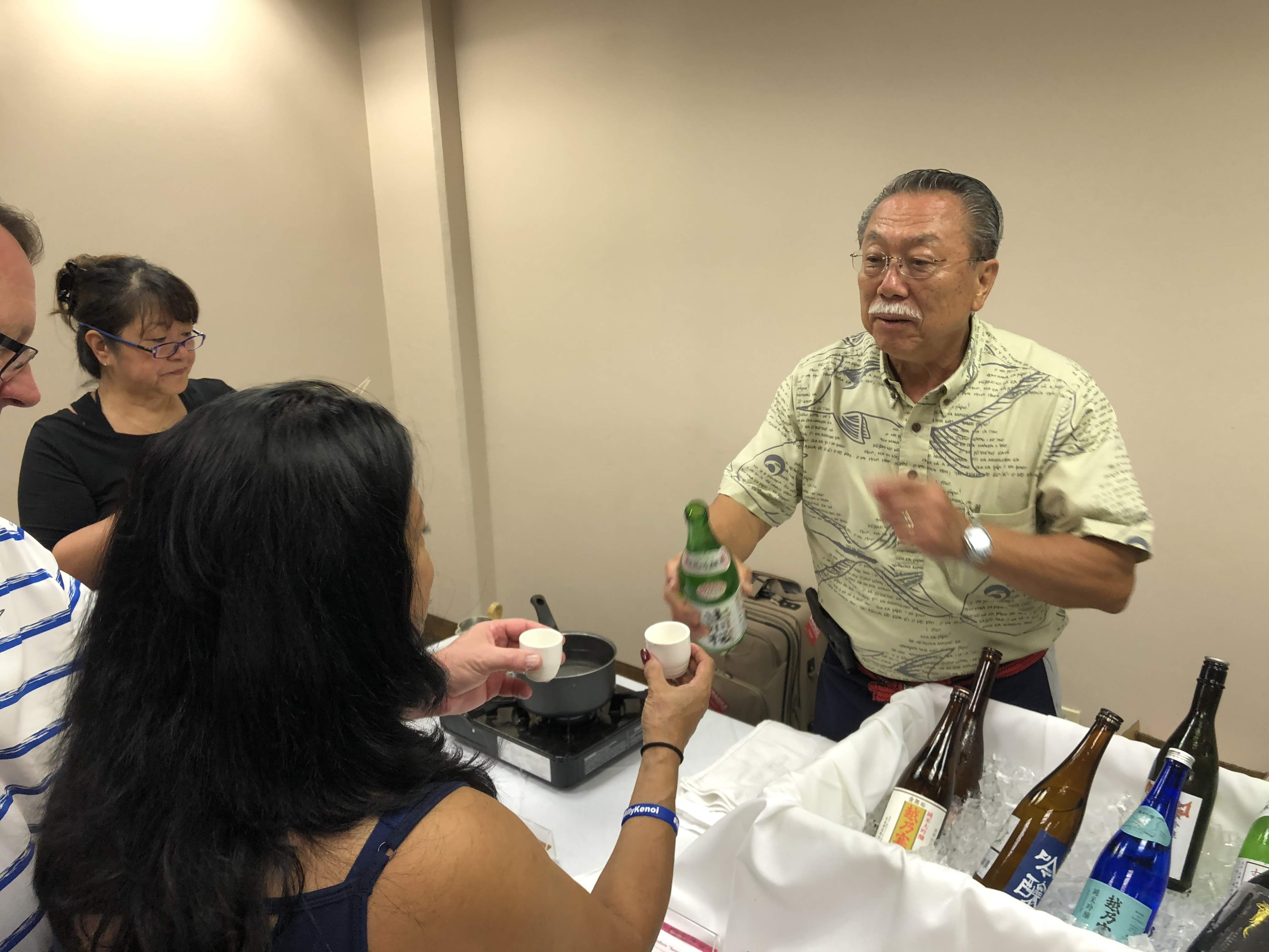 I love sake and I love enjoying sake with friends. This event was extra fun because it was like a big party except that we didn’t have to set up or clean up. The admission fee includes sake, pupu, and a sake cup to take home. (Click here to see the sake cup on Amazon.) Since we are in Hilo, I knew many of the people in attendance and made some new friends. One person whose name I recognized knew me because my dog goes to her good friend’s house when I’m out of town. Even my dog has friends in Hilo!