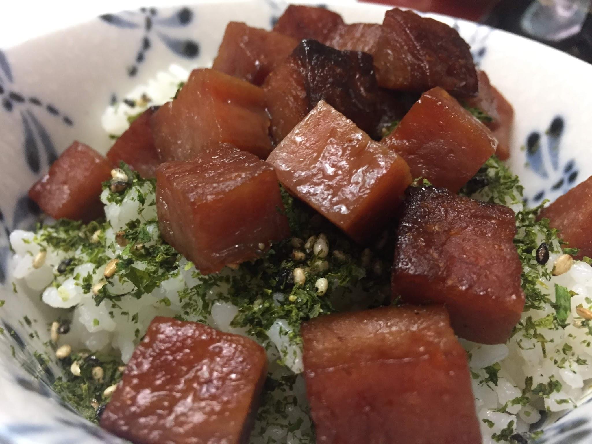 - Add shoyu and sugar directly onto crisped Spam and mix around until its absorbed by Spam cubes.
