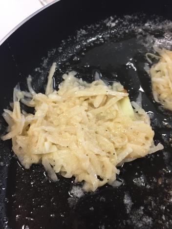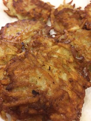 - Place a tablespoon of the mixture into the pan and fry for two minutes. Turn latkes over and fry cook for another two minutes or until golden and crispy.