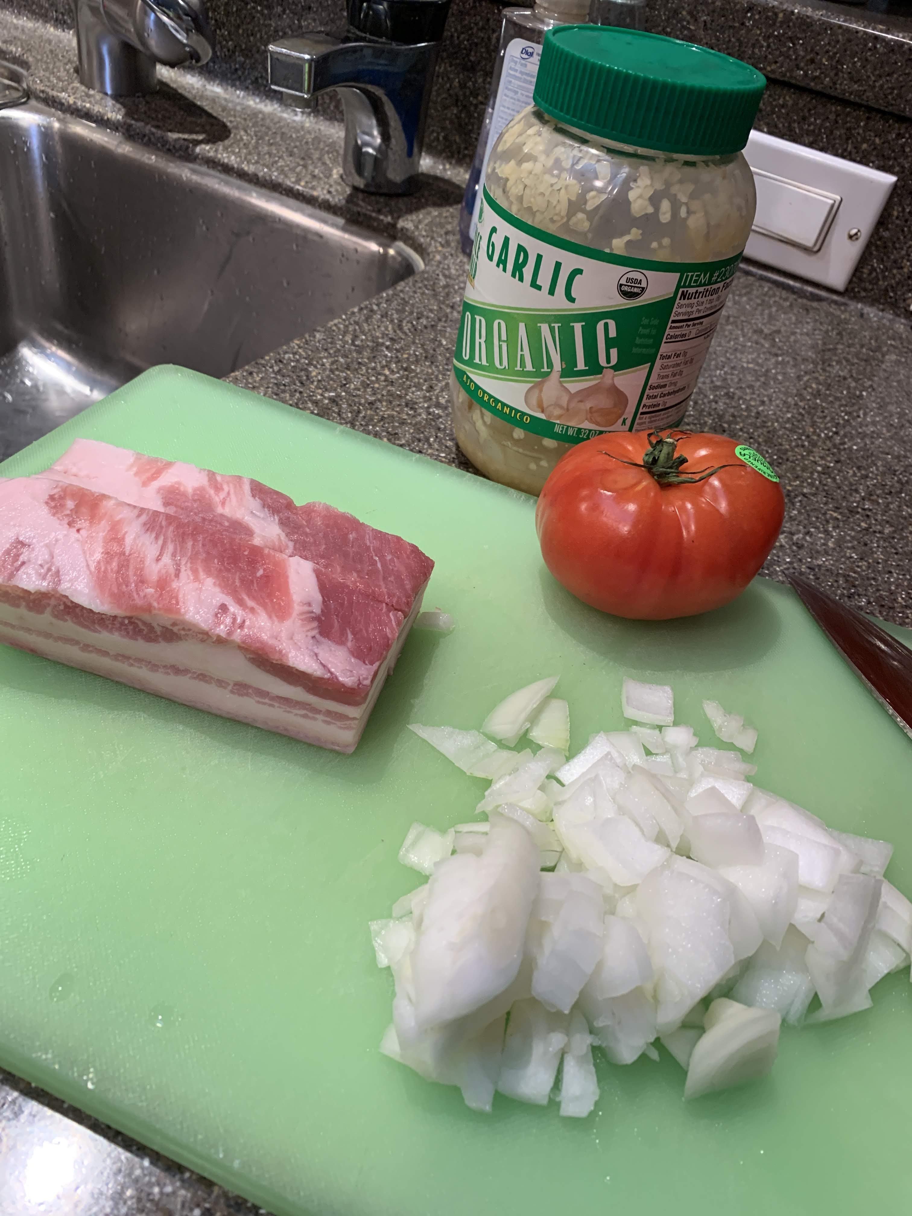 It is a simple dish that my husband and I love. I browned some onion, garlic, and tomatoes in a pot. Next, I added thinly sliced pork belly and fried it until it browned. I would have used a less fatty cut of pork but that is all I could find at the store I went to that afternoon.