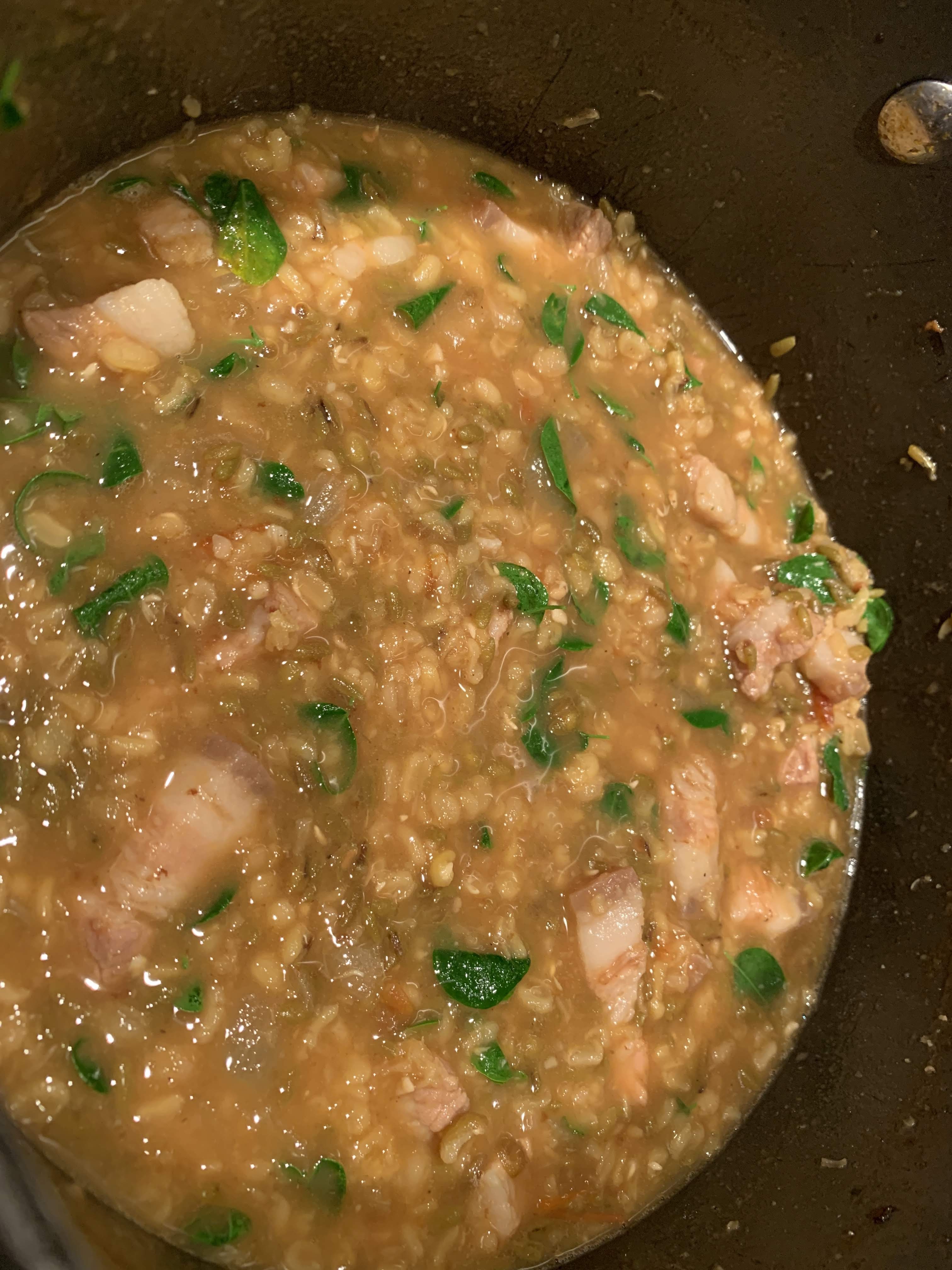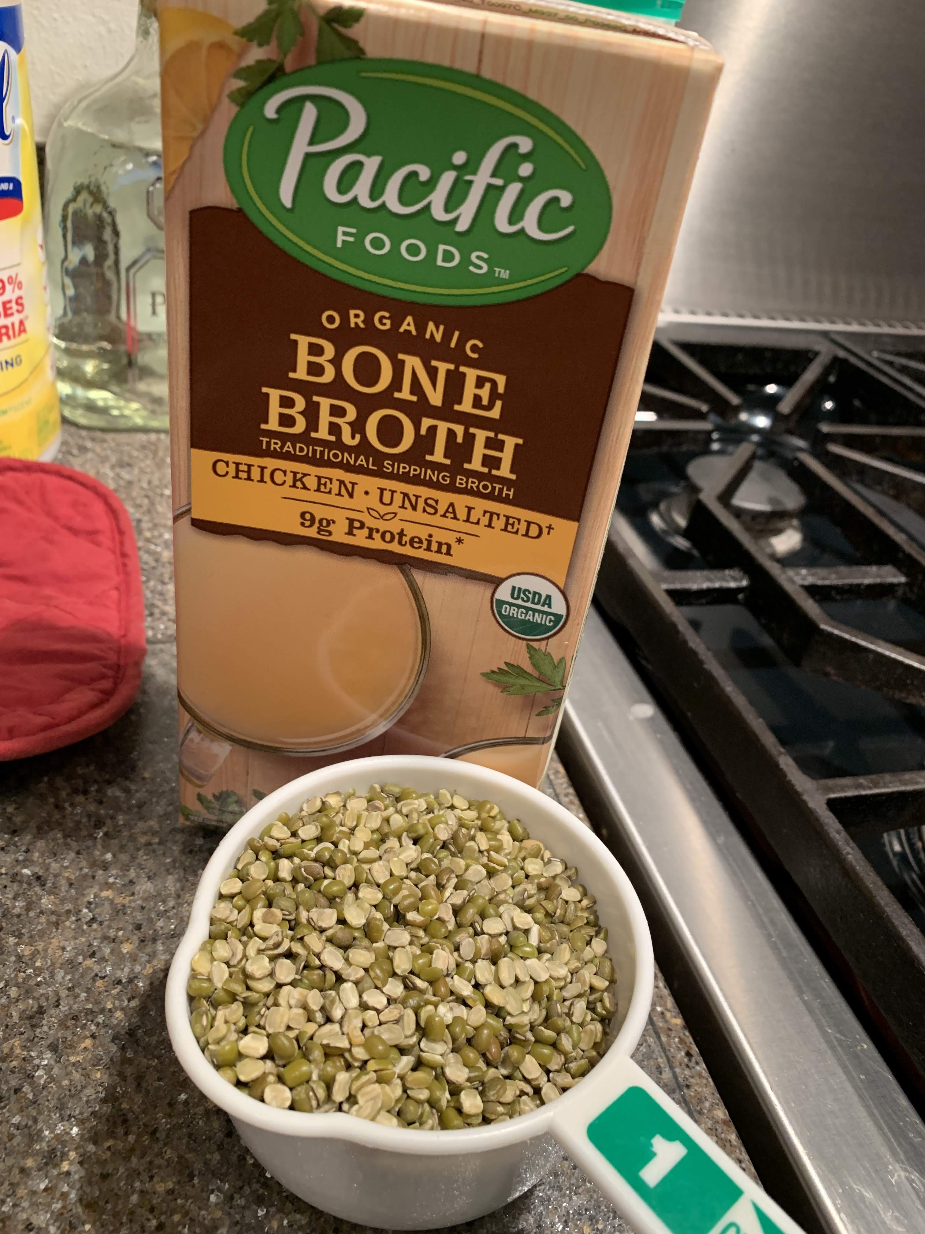 I added a box of chicken bone broth and brought it to a boil. Next, I added almost a cup of split mung beans and let it simmer.