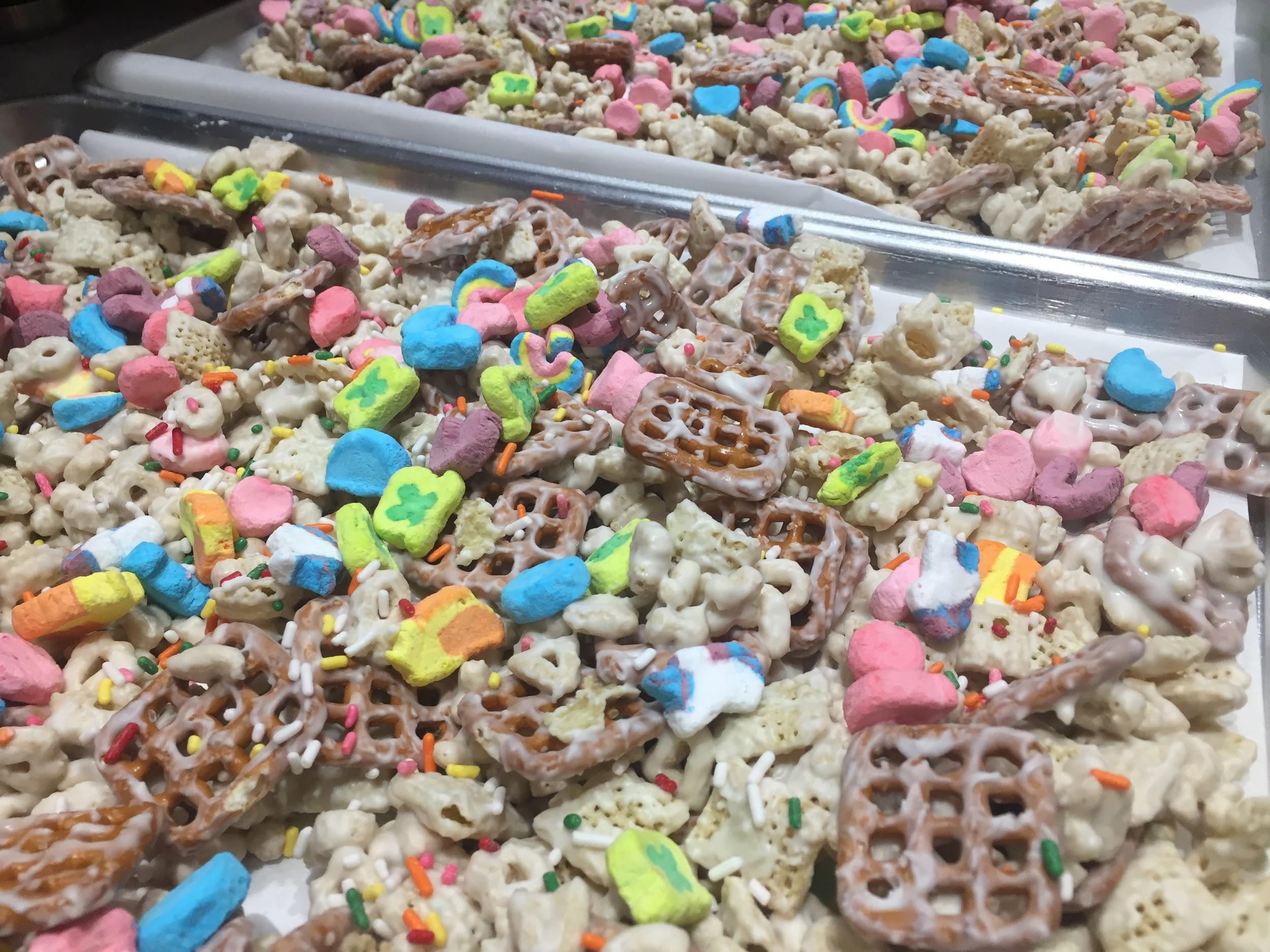- Spread on two parchment-lined sheet pans and sprinkle on Lucky Charms marshmallows and sprinkles.