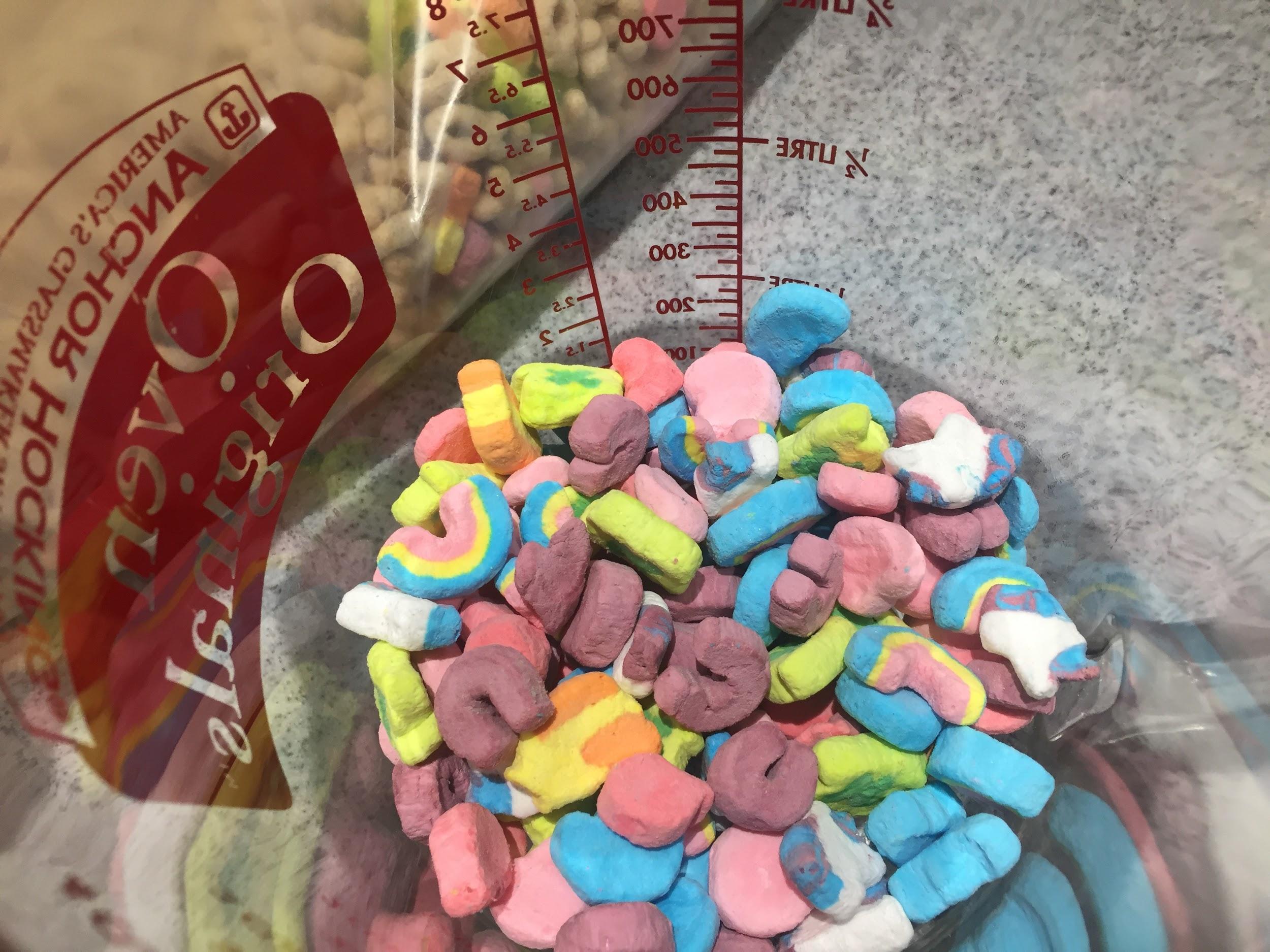 - 1 (16 oz.) box of Lucky Charms cereal (divided)