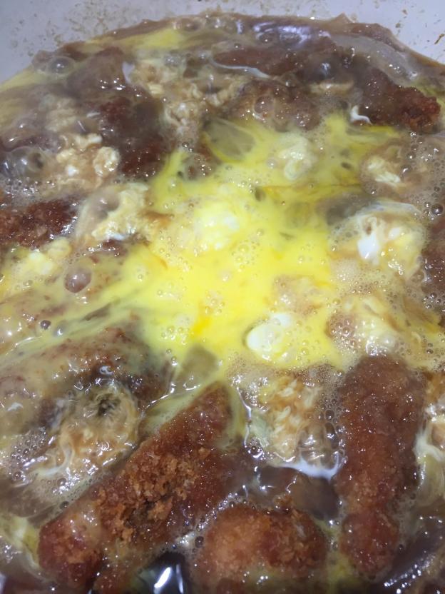 - Add the pieces of chicken katsu to the simmering sauce and onions then immediately add the beaten eggs to the katsu/onion mixture and cover the pan with a lid.