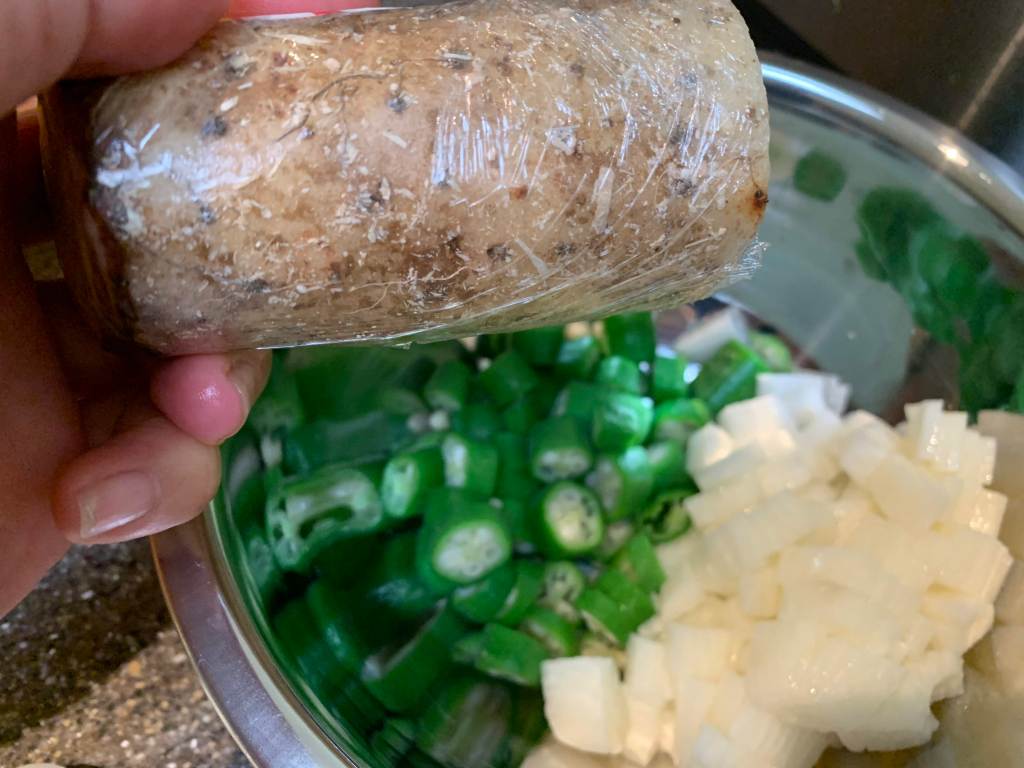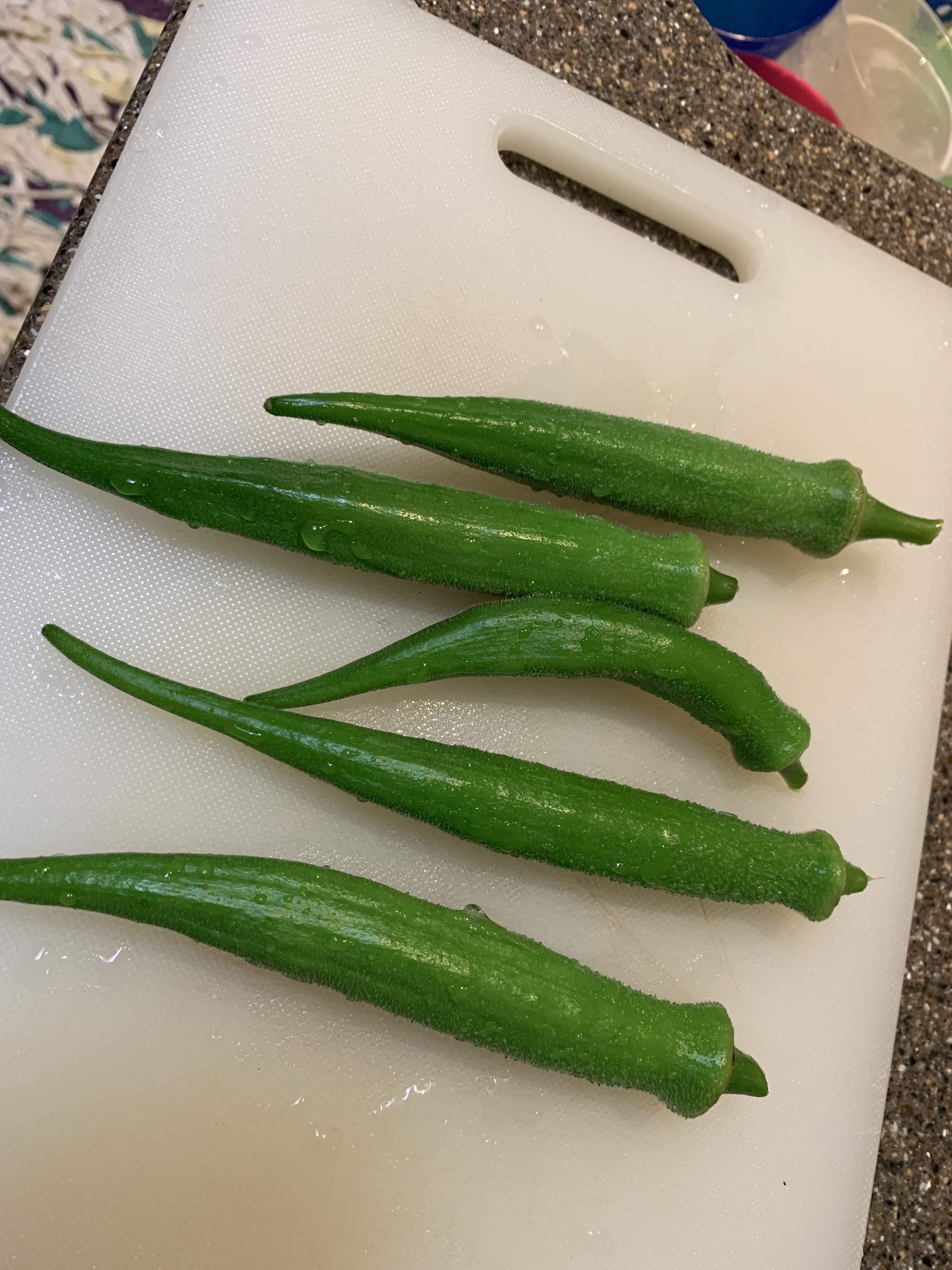 I washed the okra and parboiled it and cooled it down. Then just chop it into small pieces and put it in a bowl.