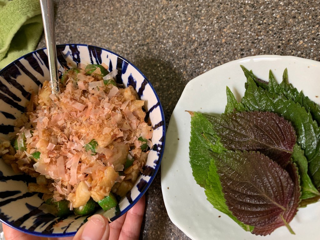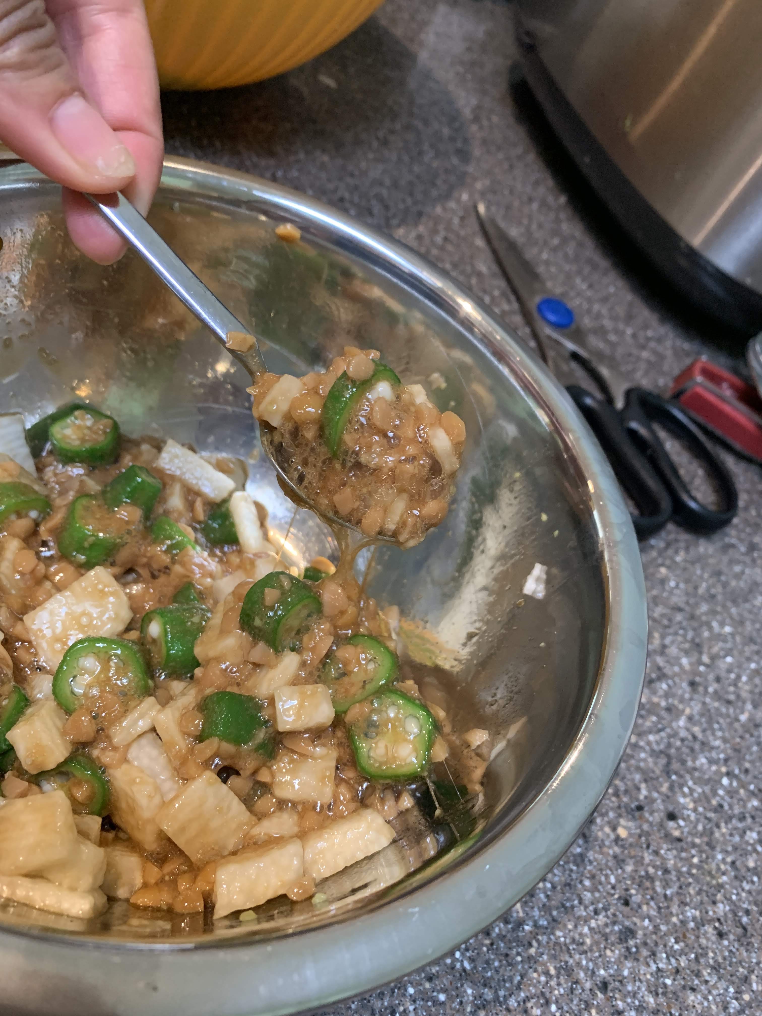 I’ve been trying to grow okra in my garden. It has slowly been producing and I’ve been able to make an occasional side dish with the few okra that I harvest. This morning, as I walked around the garden, I found five okra that were ready for harvest. My husband had just come back from Oahu where I had sent him to Marukai to pick up yamaimo. I had natto in the fridge. Perfect!!!