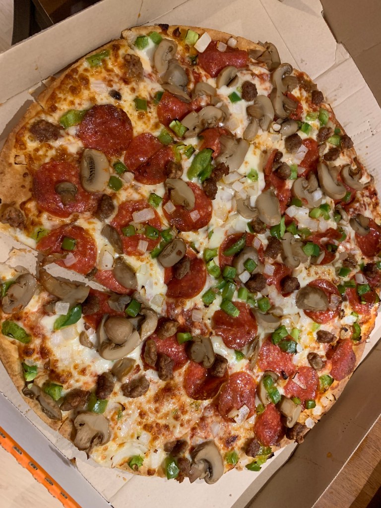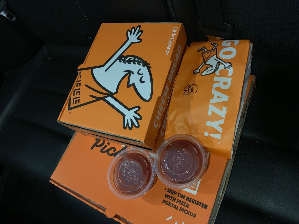 I had gotten the flyer in the mail that instructed me that I could put in my order using the mobile app. I downloaded the app and then found out that it was not yet up and running. I tried looking up the menu online but it was a little confusing. So, I decided to just go in person and put in my order. The parking lot is strictly divided between WikiFresh and Little Caesar’s and on the day I went, there was a parking lot attendant making sure that LC customers didn’t park in the WF spaces. I got my parking space and walked in around 5:30 p.m. The drive through line was very long. I ordered a thin crust Ultimate Supreme, Italian Cheesy Bread, and a Crazy Bread.