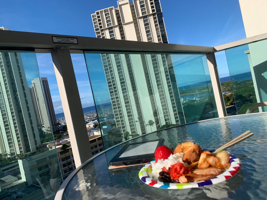 The next morning, I woke up early and went ‘wogging’ around the area. I ended up getting some breakfast from Foodland Farms for my sleepy-head family. My family scored with fried rice, bacon, salmon, eggs, and fruits. I enjoyed my breakfast on the lanai with an amazing view of the ocean.