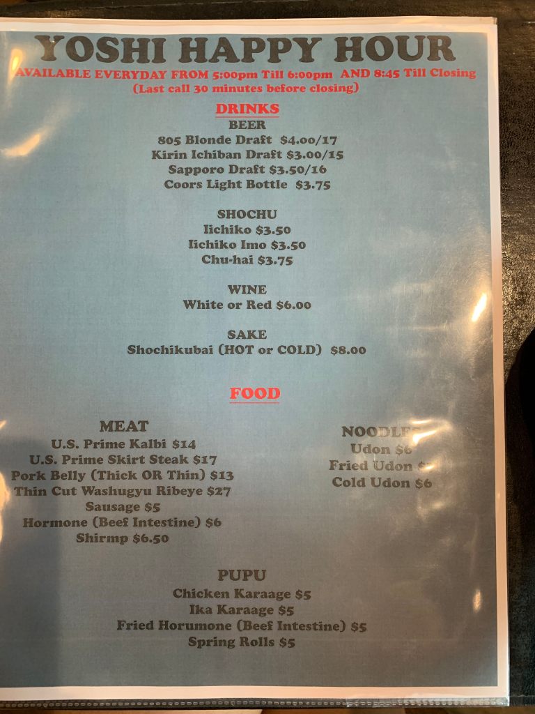 We topped off the evening with dinner at Yakiniku Yoshi. We were meeting my brother and his family there but got there a little early. It was perfect timing for Yoshi Happy Hour! Like Misty–I love happy hour! I highly recommend going early for happy hour! It was easy to get parking and a table! Awesome weekend on Oahu. Living Hilo Style in Honolulu.