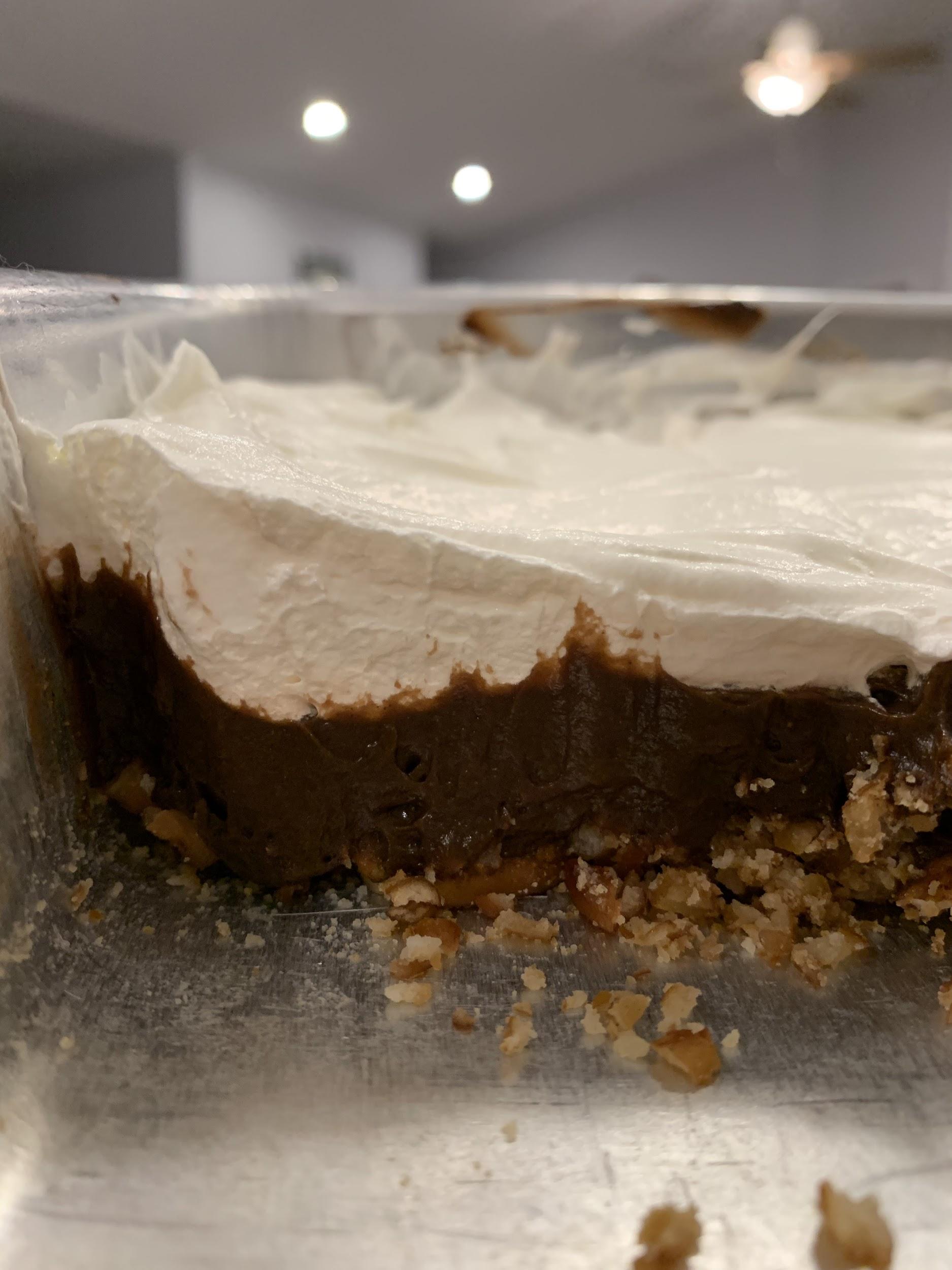 - After pretzel crust has cooled, add pudding to the pretzel layer.