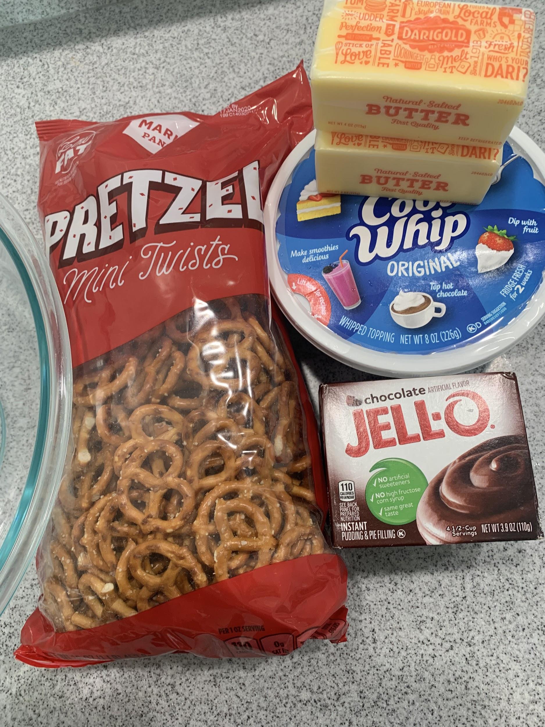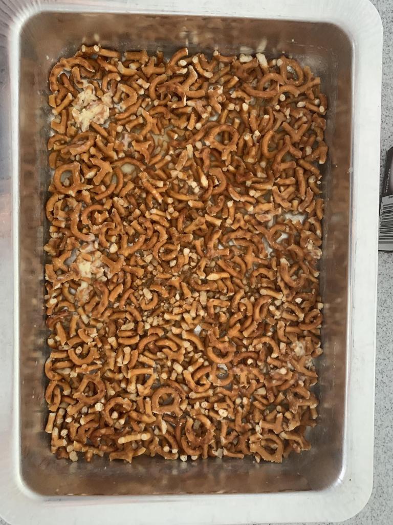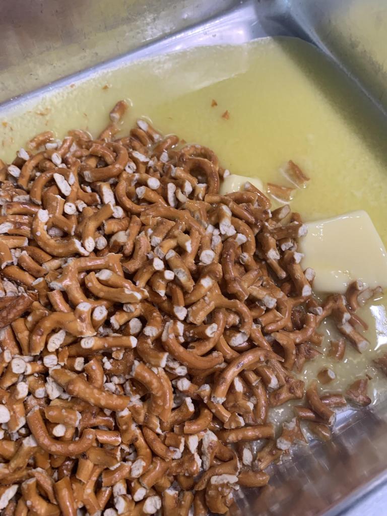 - Add melted butter and crushed pretzels to a 9” x 13” pan and pat down to make a crust. Don’t dirty an extra bowl for this step, mix directly in the 9 x 13 pan.