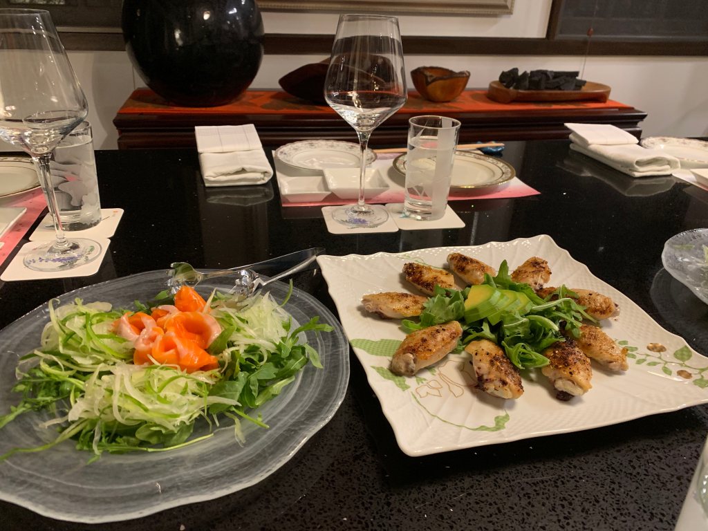 My husband had just come back from Costco with a pack of salami and prosciutto. I had a Hokkaido Camembert from my trip last month and a Parmigiano-Reggiano that I had brought back from NYC. I added some Trader Joe’s olives and some grapes and crackers from KTA. I garnished it with some sprigs of rosemary from my garden and the platter was ready to go!