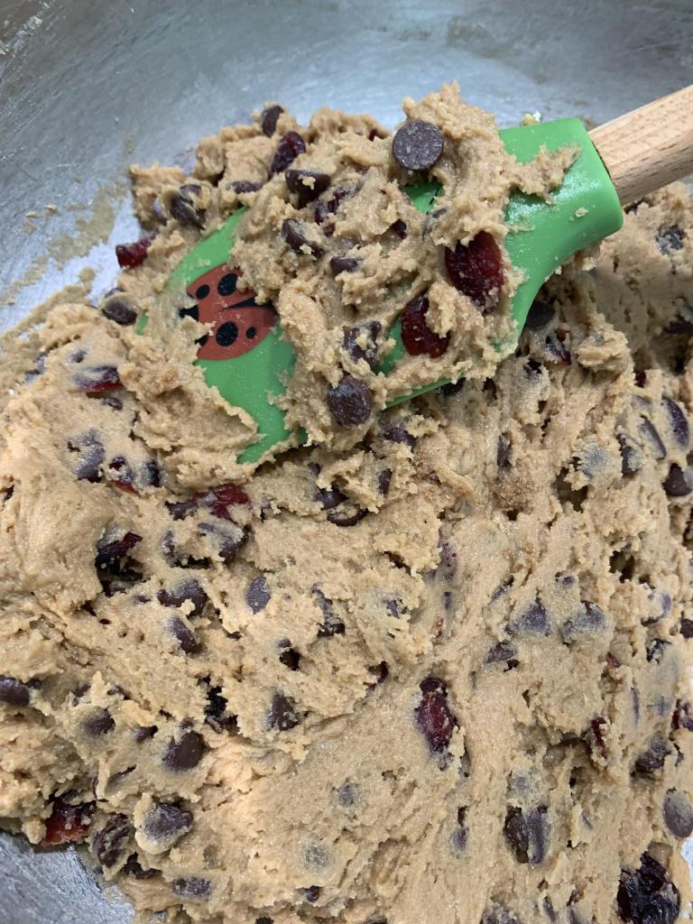 - Add chocolate chips and cranberries (or nuts) and mix.