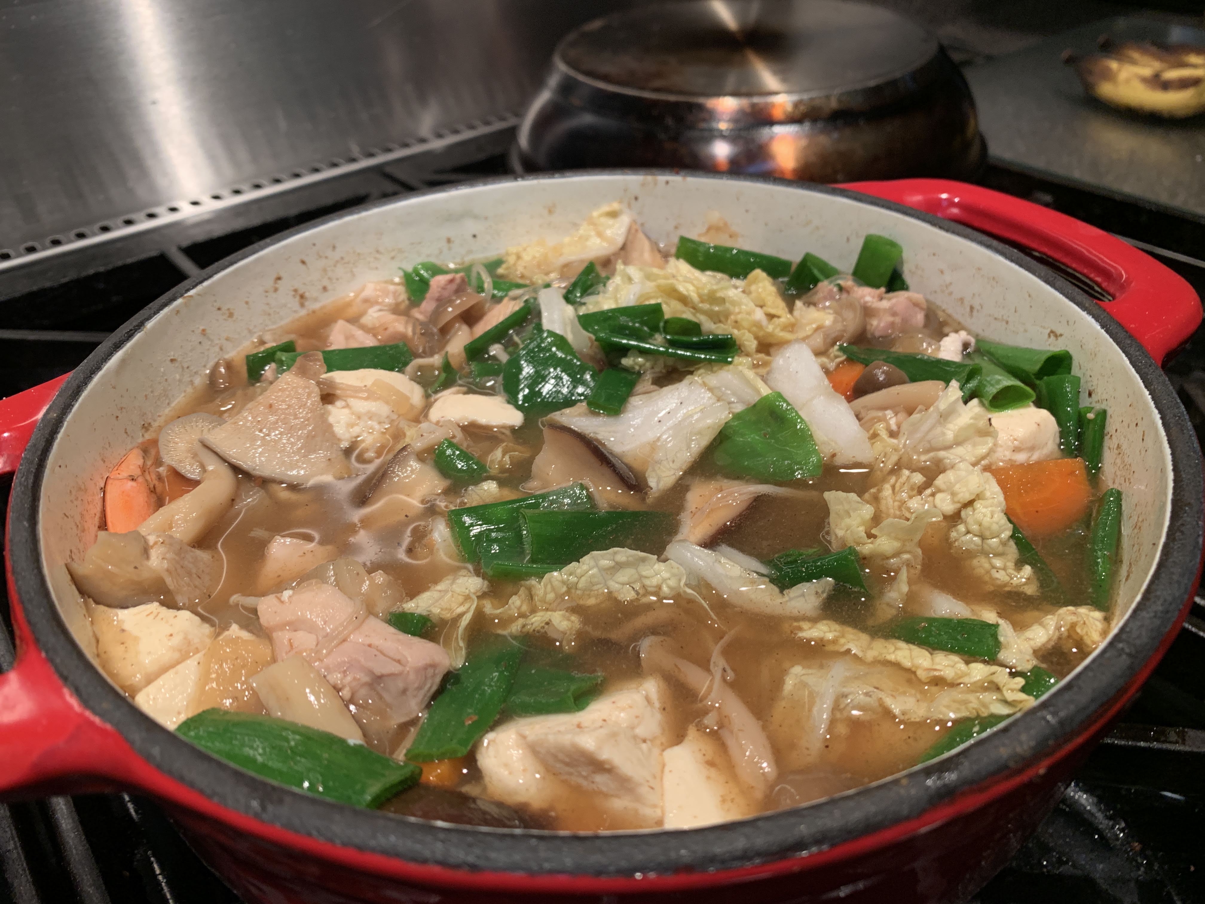 Tonight, I used the Tennen dashi as the base of the yosenabe hot pot that I made for dinner. KTA has a recipe on their website for yosenabe. (https://www.ktasuperstores.com/recipes/yosenabe-hot-pot ) The seasoning I am using for tonight’s yosenabe soup broth is slightly different than the KTA one. I added about 2 Tablespoons each of mirin, shoyu, and sake to the dashi-based broth. I added Chinese cabbage, shiitake, enoki, and shimeji mushrooms at that I bought at KTA. I used chopped green onions from my garden and also included onions, shrimp, chicken, and mahimahi. I usually add shirataki noodles, but remembered that I had some rice noodles in my pantry and wanted to use that up so used that instead.
