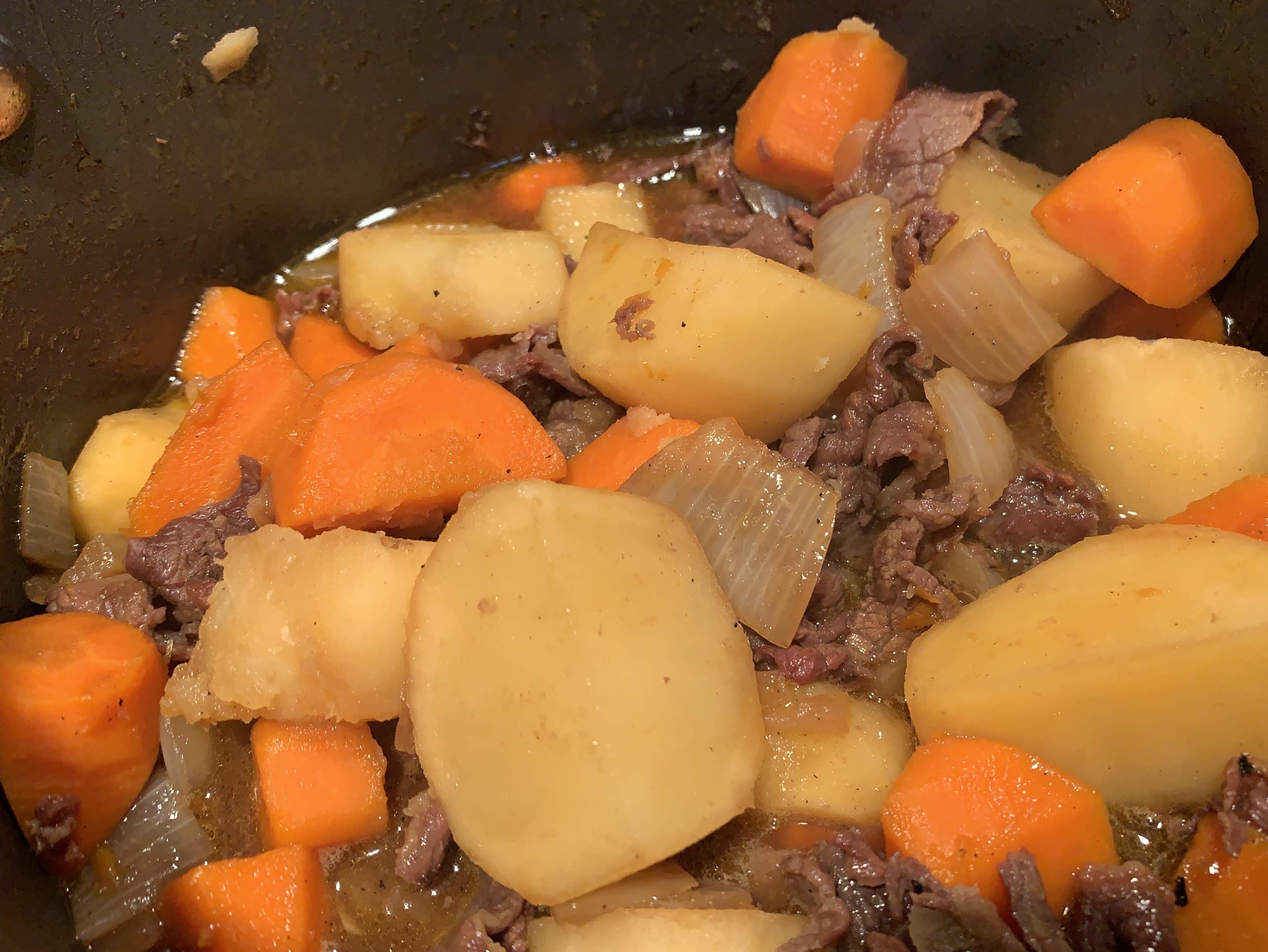 I chopped the onions and tossed it in a pot and let it heat up and soften. Next, I peeled and chopped the carrots and threw that in. I did the same with the potatoes and let those ingredients heat up. I sliced up the teri beef, added some water, shoyu, mirin, and a couple of ginger pieces and let the ingredients simmer.